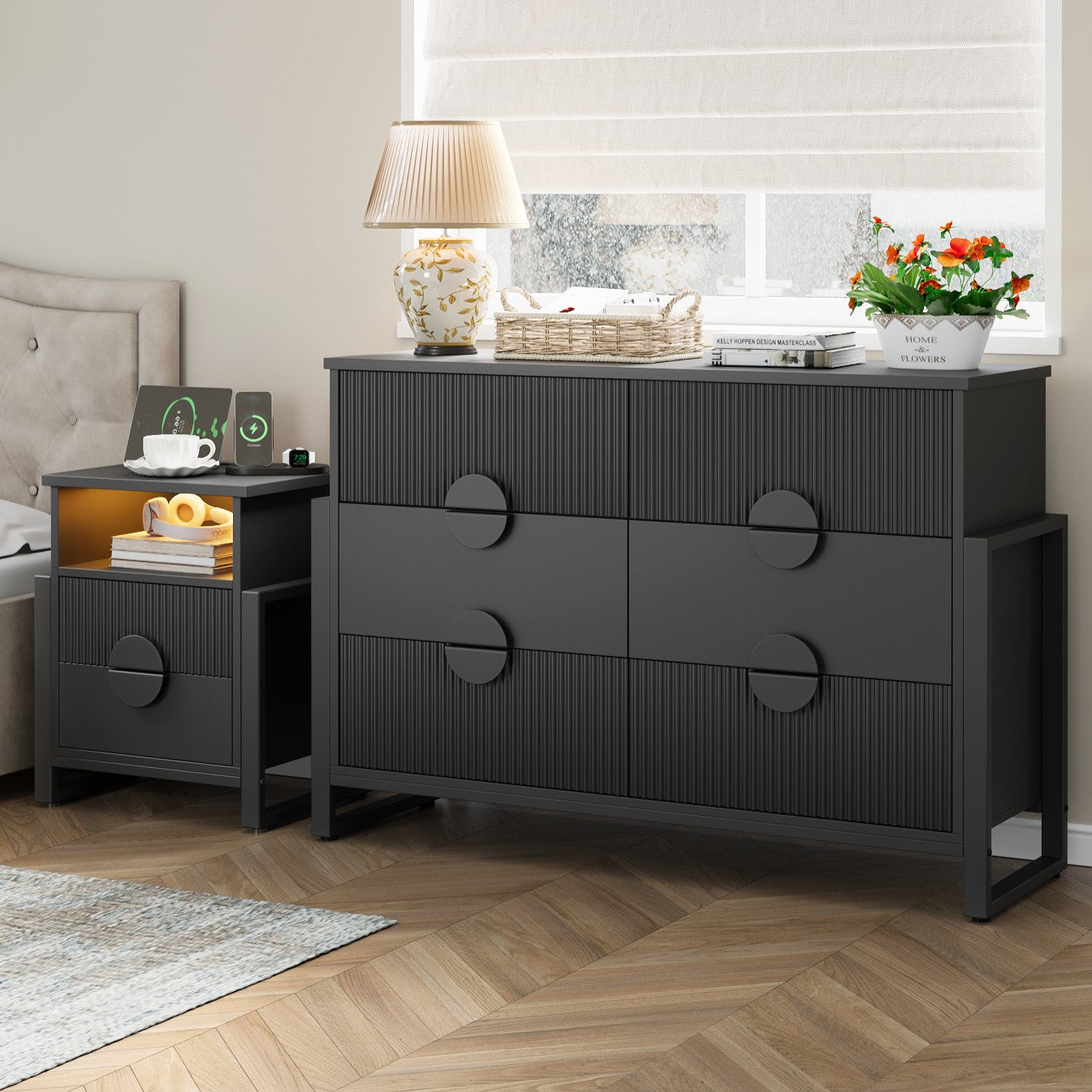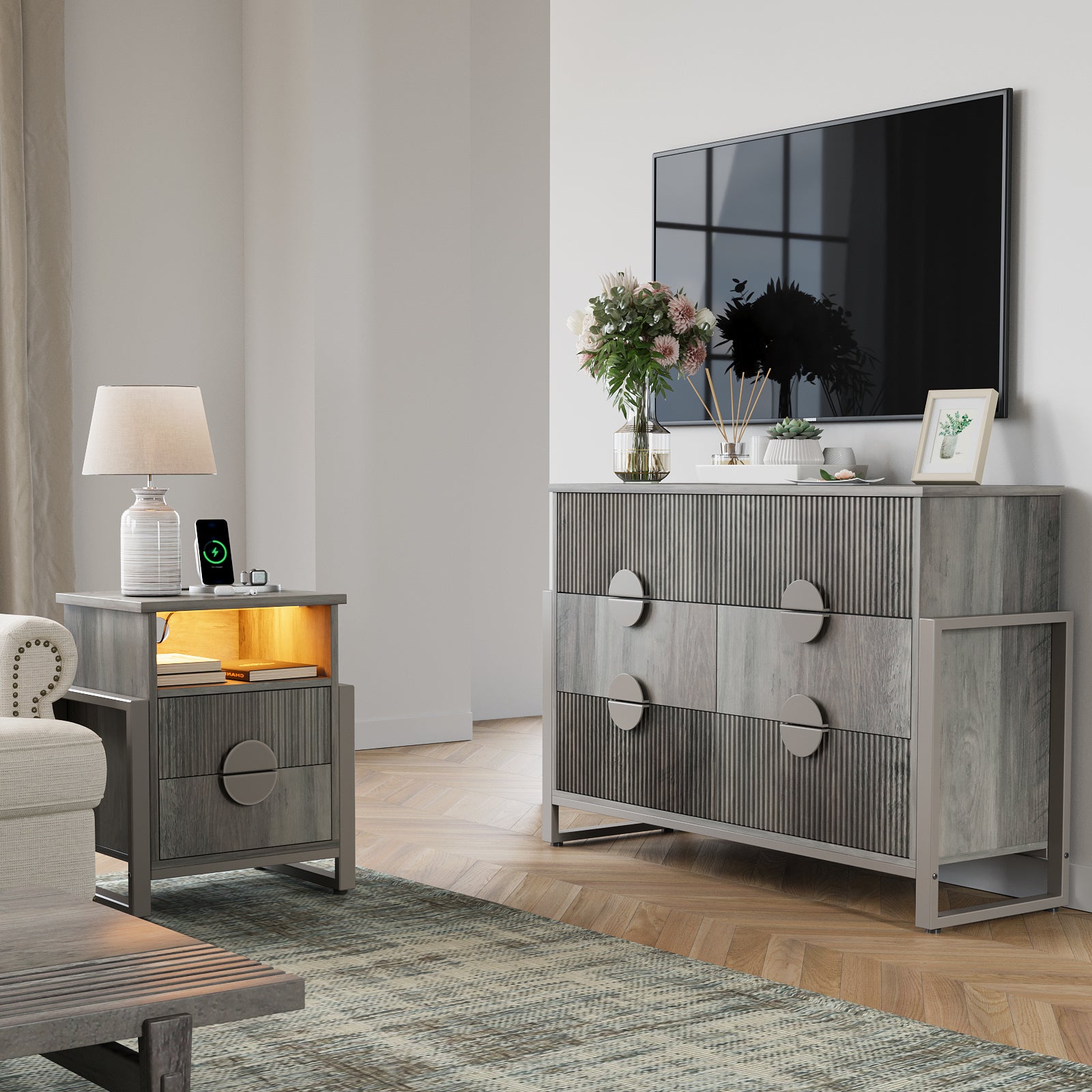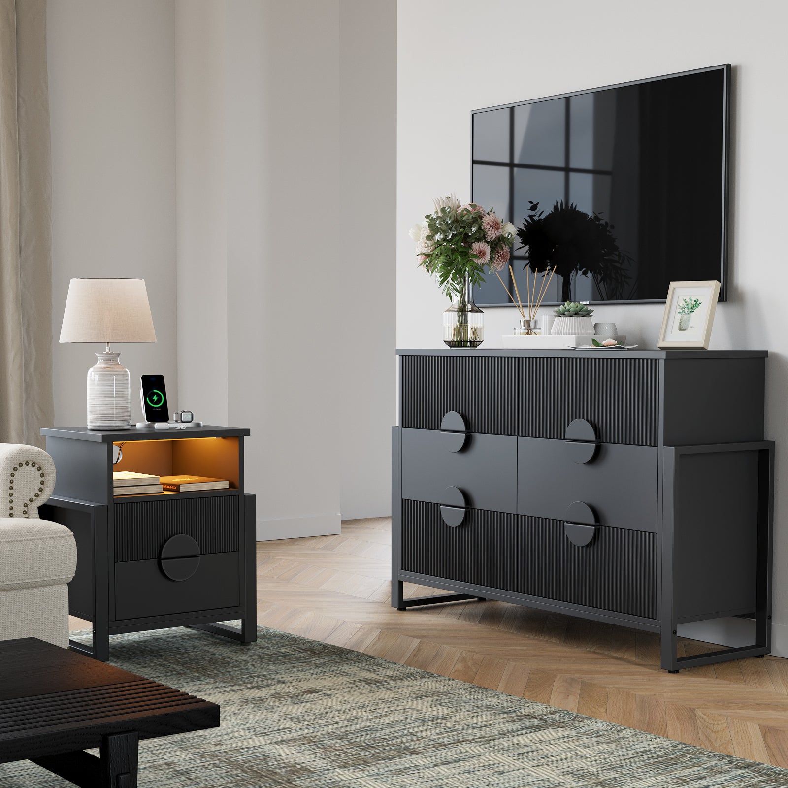 Transform your bedroom with our beautifully coordinated furniture set, which includes a nightstand and a double dresser. Blends stylish fluted grain with smooth, minimalist lines. The Same style and harmony, no need to worry about mismatching. Each nightstand features 2 drawers and 1 open shelf, ideal for storing frequently used items. The dresser keeps your wardrobe orderly and accessible, while nightstands provide room for essentials, books, and decorations, suiting any style.. Bedside table is equipped with LED Lights, 1 USB port, 1 Type-C port and 2 standard AC outlets. The metal legs legs provides strong support for the vanity and gives you a high level of peace of mind.