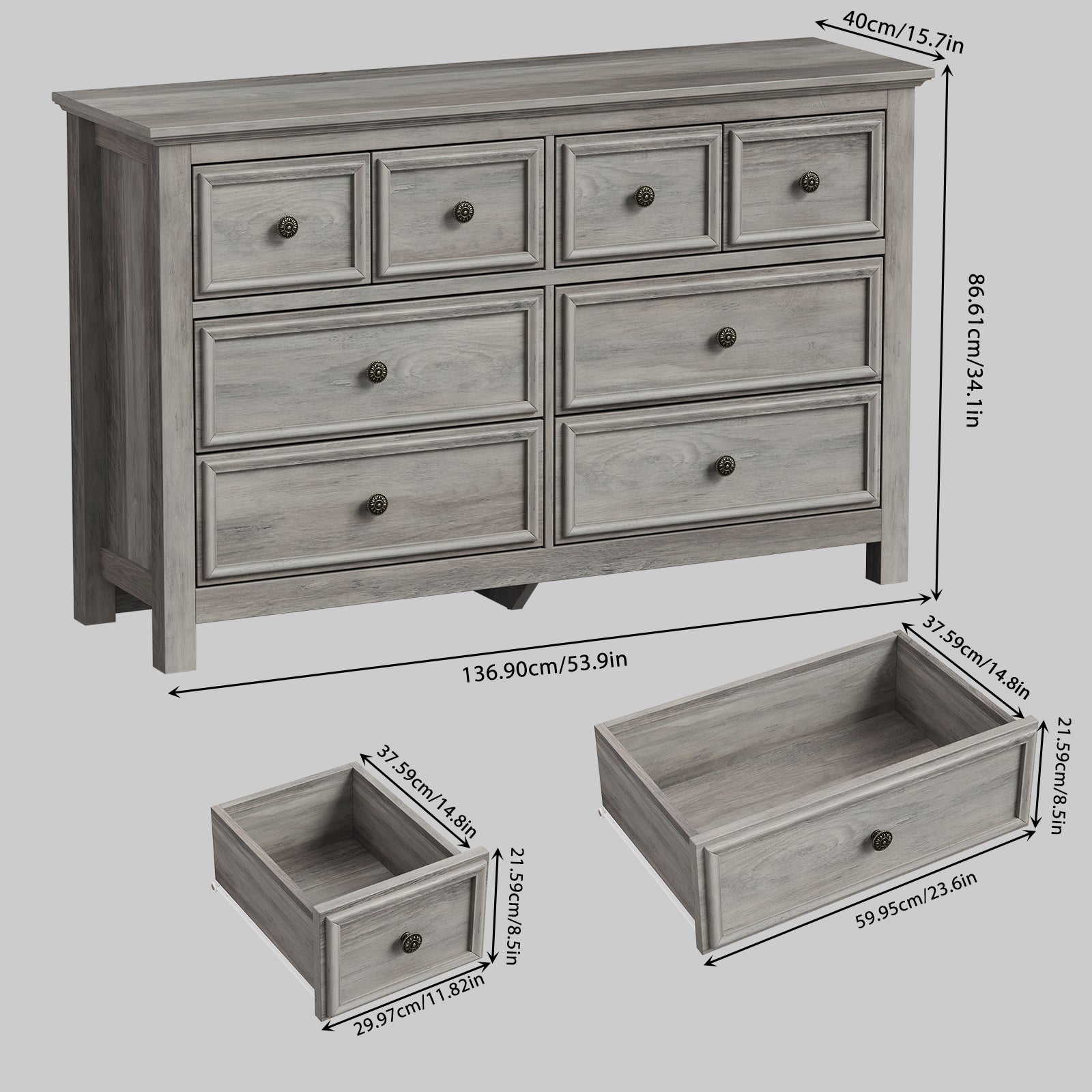 8 Drawer Dresser Dimensions: 53.9"L x 15.7"W x 34.1"H/(137 x 40 x 86.6) cm