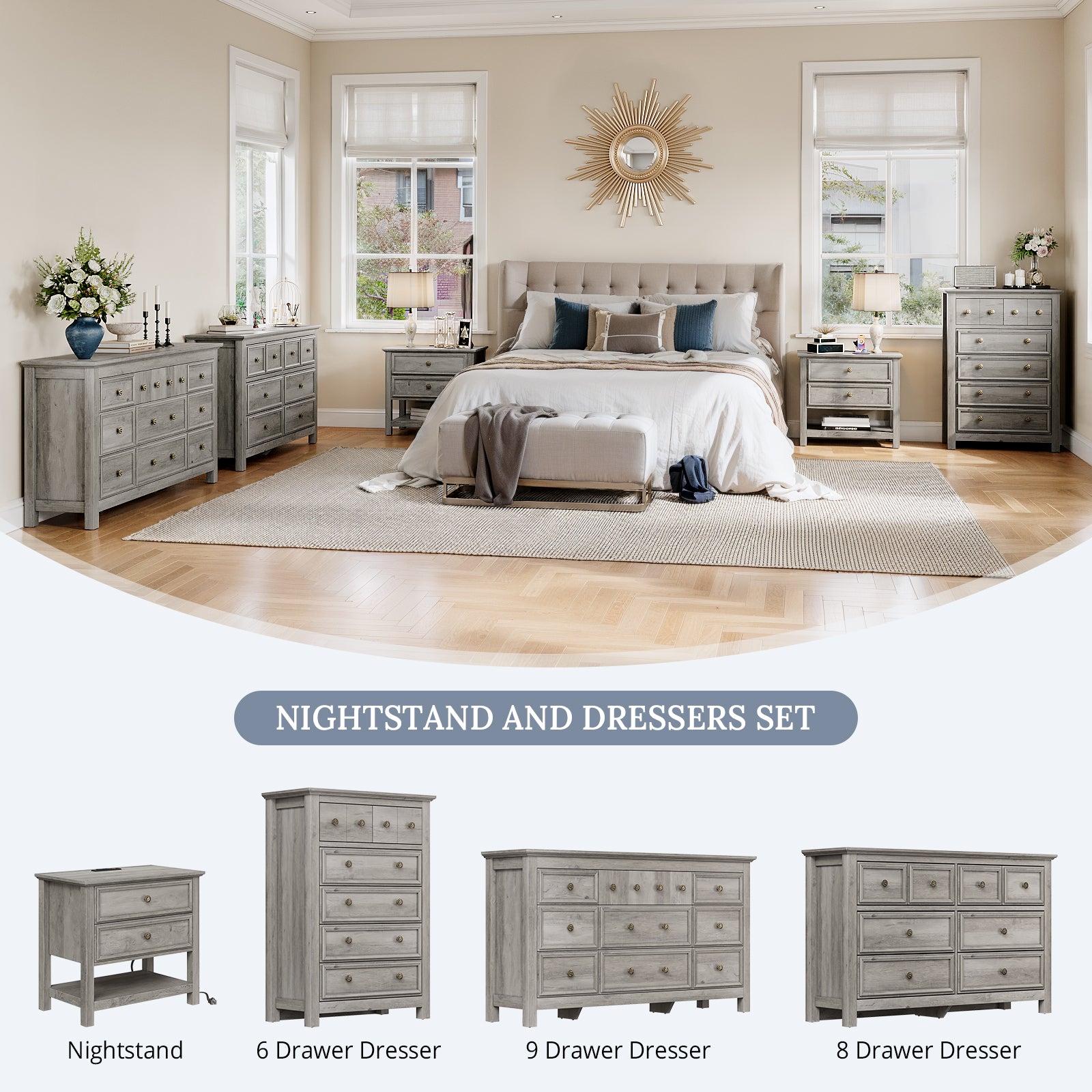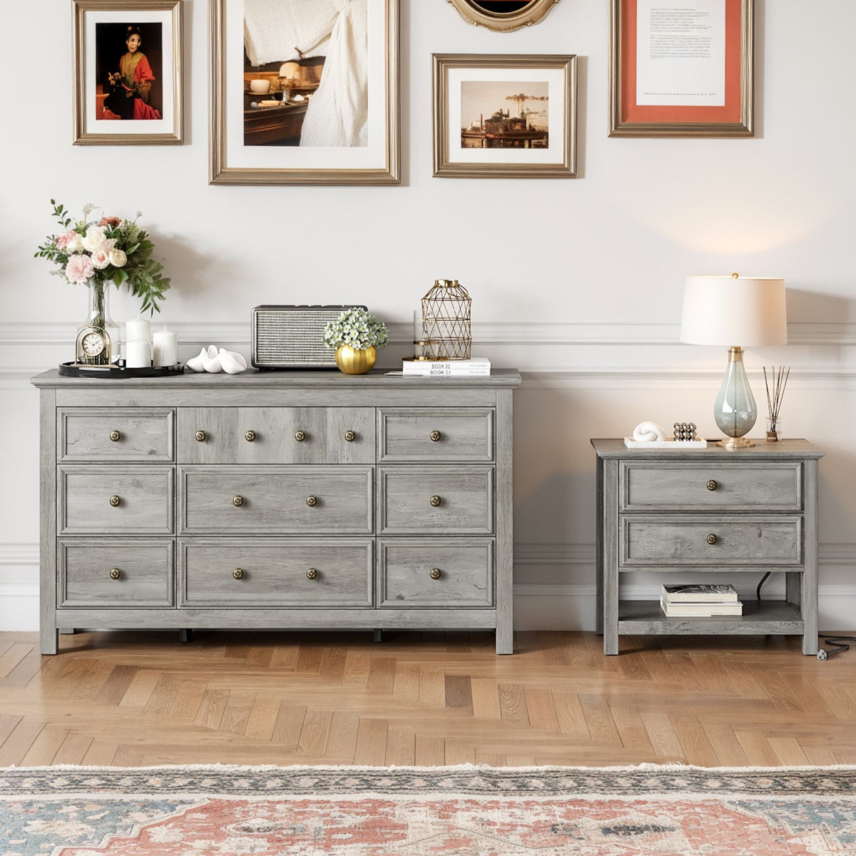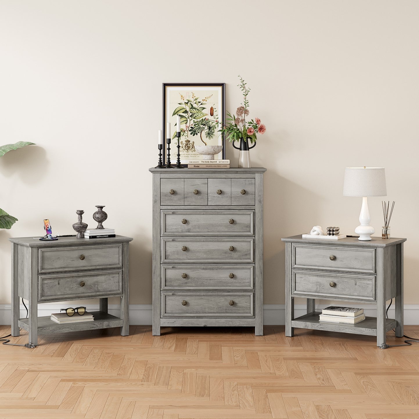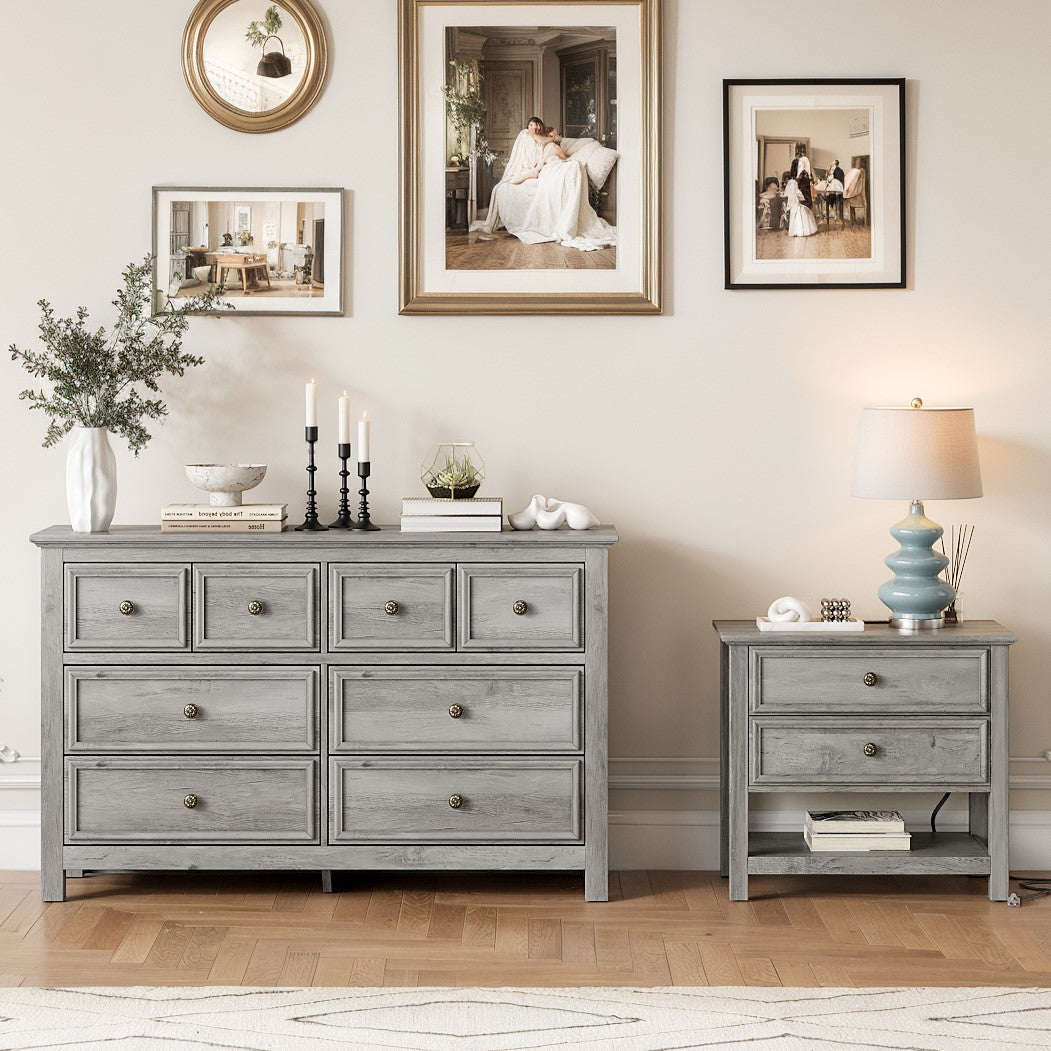 This bedroom set Included 1pc Drawer Chest and 1/2pcs nightstand. Blends rustic wood grain with smooth, minimalist lines. The Same style and harmony, no need to worry about mismatching. Each nightstand features 2 drawers and 1 open shelf, ideal for storing frequently used items. This bedroom wardrobe set features a reinforced tabletop design that is both sturdy and versatile. It provides reliable support for decorations, books, and daily essentials, combining aesthetics with practicality. Bedside table is equipped with 1 USB port, 1 Type-C port and 2 standard AC outlets. The stable legs provides strong support for your solid wood dresser and gives you a high level of peace of mind.