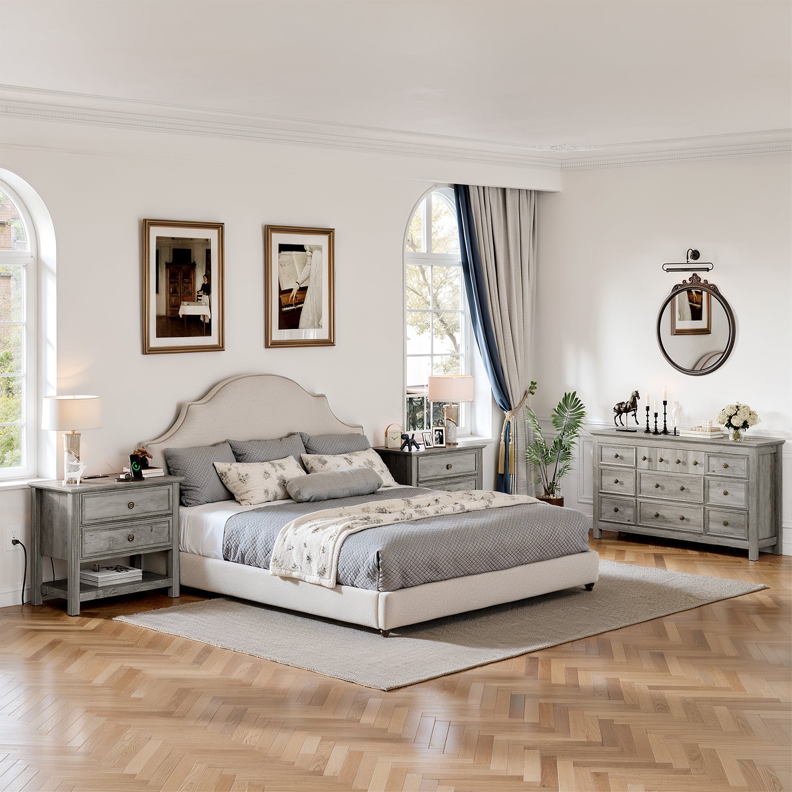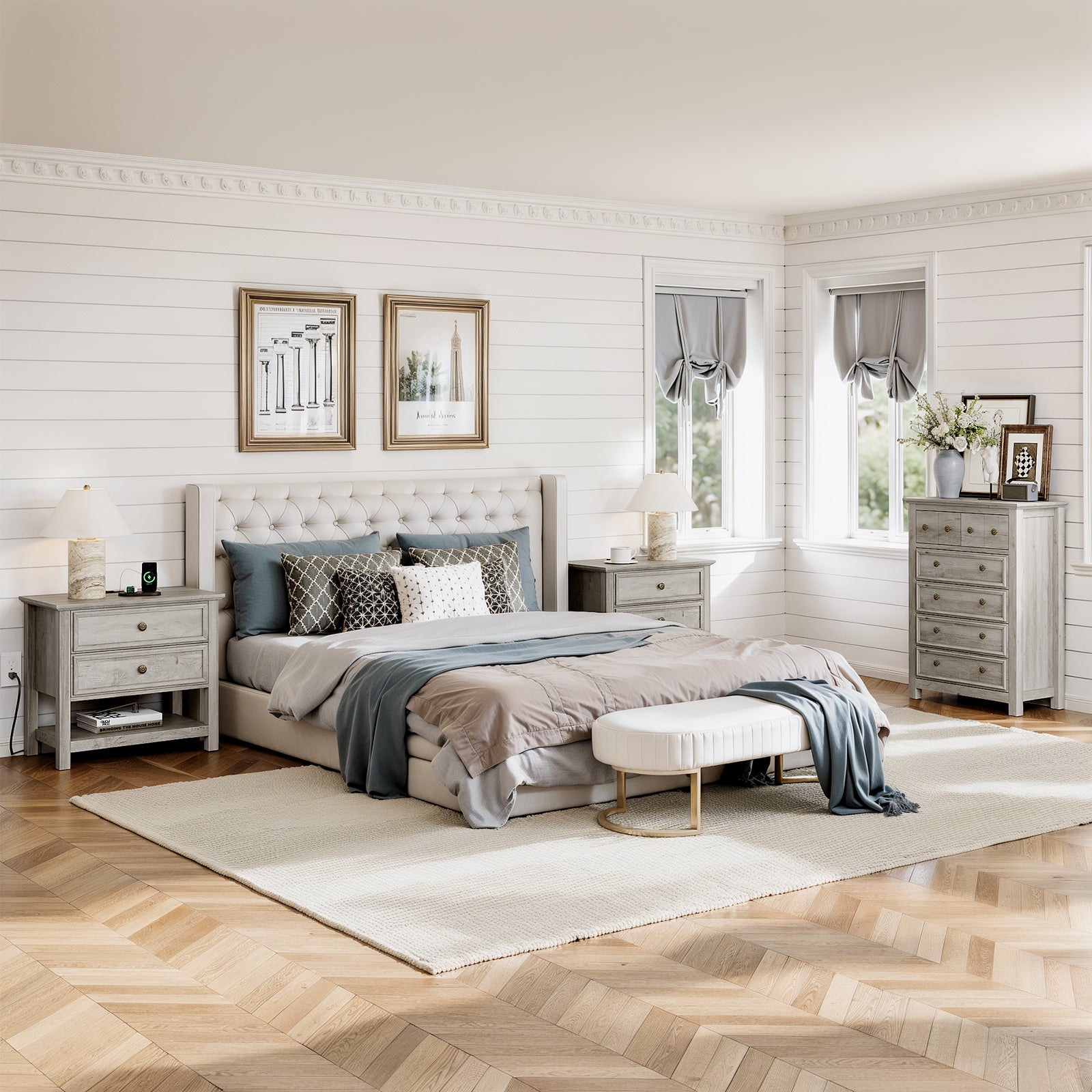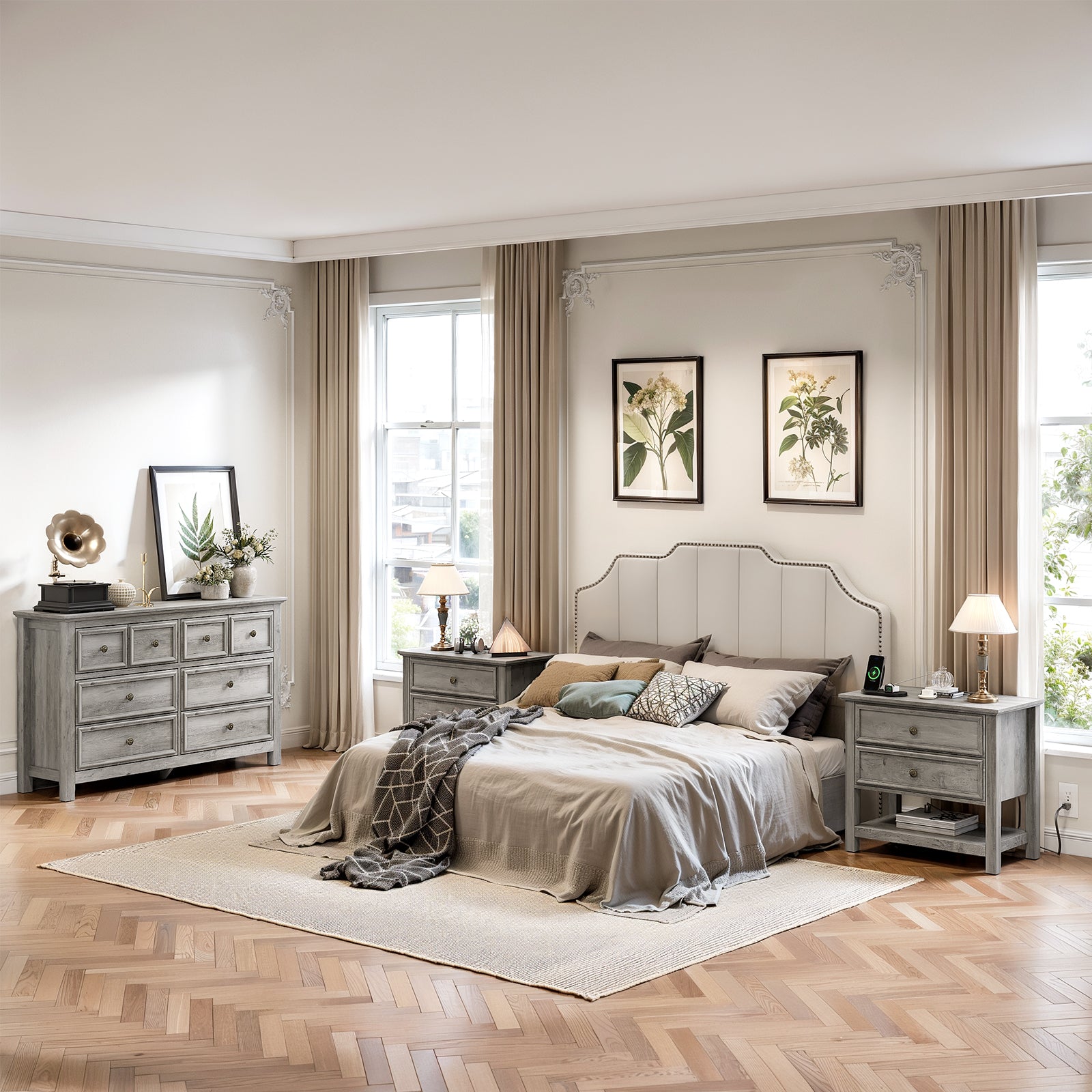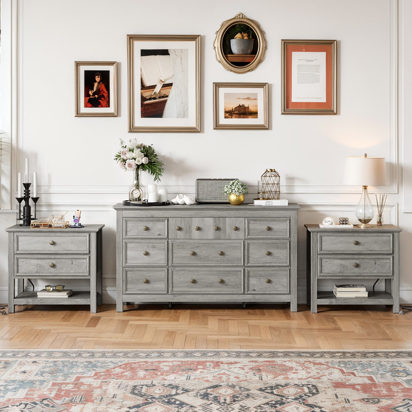 This bedroom set Included 1pc Drawer Chest and 1/2pcs nightstand. Blends rustic wood grain with smooth, minimalist lines. The Same style and harmony, no need to worry about mismatching. Each nightstand features 2 drawers and 1 open shelf, ideal for storing frequently used items. This bedroom wardrobe set features a reinforced tabletop design that is both sturdy and versatile. It provides reliable support for decorations, books, and daily essentials, combining aesthetics with practicality. Bedside table is equipped with 1 USB port, 1 Type-C port and 2 standard AC outlets. The stable legs provides strong support for your solid wood dresser and gives you a high level of peace of mind.