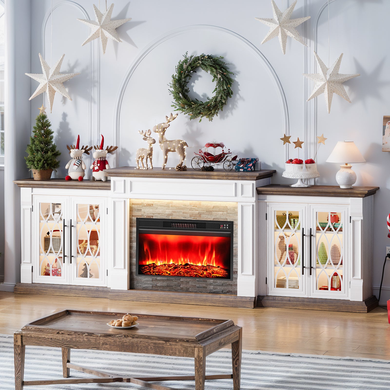 This 100 inch fireplace TV stand with mantel features adjustable, realistic logs and flames, creating the illusion of a real fireplace while adding warmth and character to your decor. The mantel includes a 30 inch plug-in electric fireplace that is both safe and energy-efficient. It heats a room quickly and has an automatic shut-off mechanism to prevent overheating. The fireplace mantel is flanked by storage cabinets, each with two adjustable and removable shelves to accommodate diverse storage needs. The sideboard can be used in match the mantel or independently, offering flexibility in adapting to any space. Crafted from engineered wood with a rustic, stacked stone appearance and beautiful edges, this mantel combines rustic and traditional styles seamlessly.The mantel and cabinet has LED light strips that can bring a strong festive atmosphere to your room. The top of sideboard has a charging station with 2 power sockets, 1 Type-C port and 1 USB port, allows you to charge mobile devices such as cell phone, tablet etc.