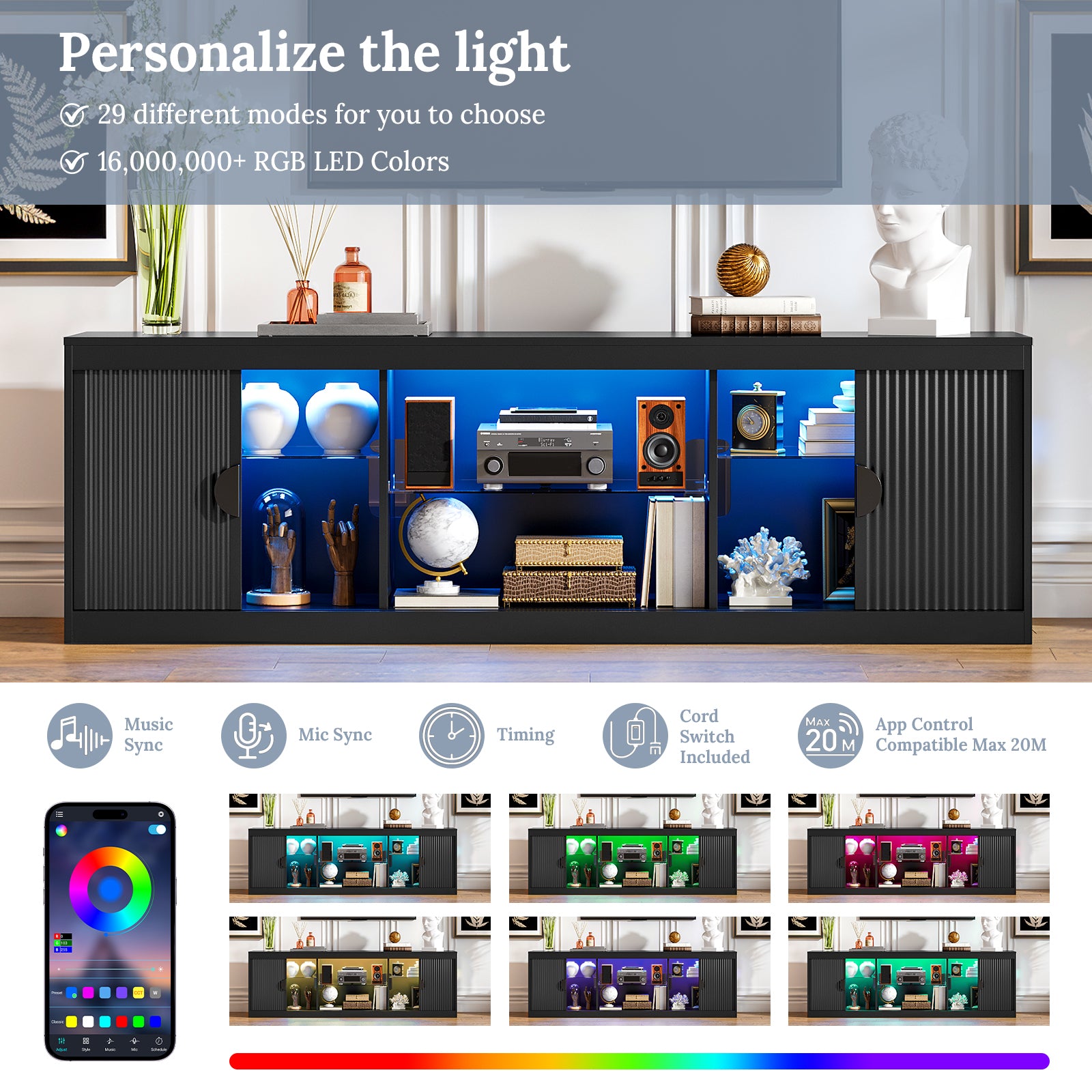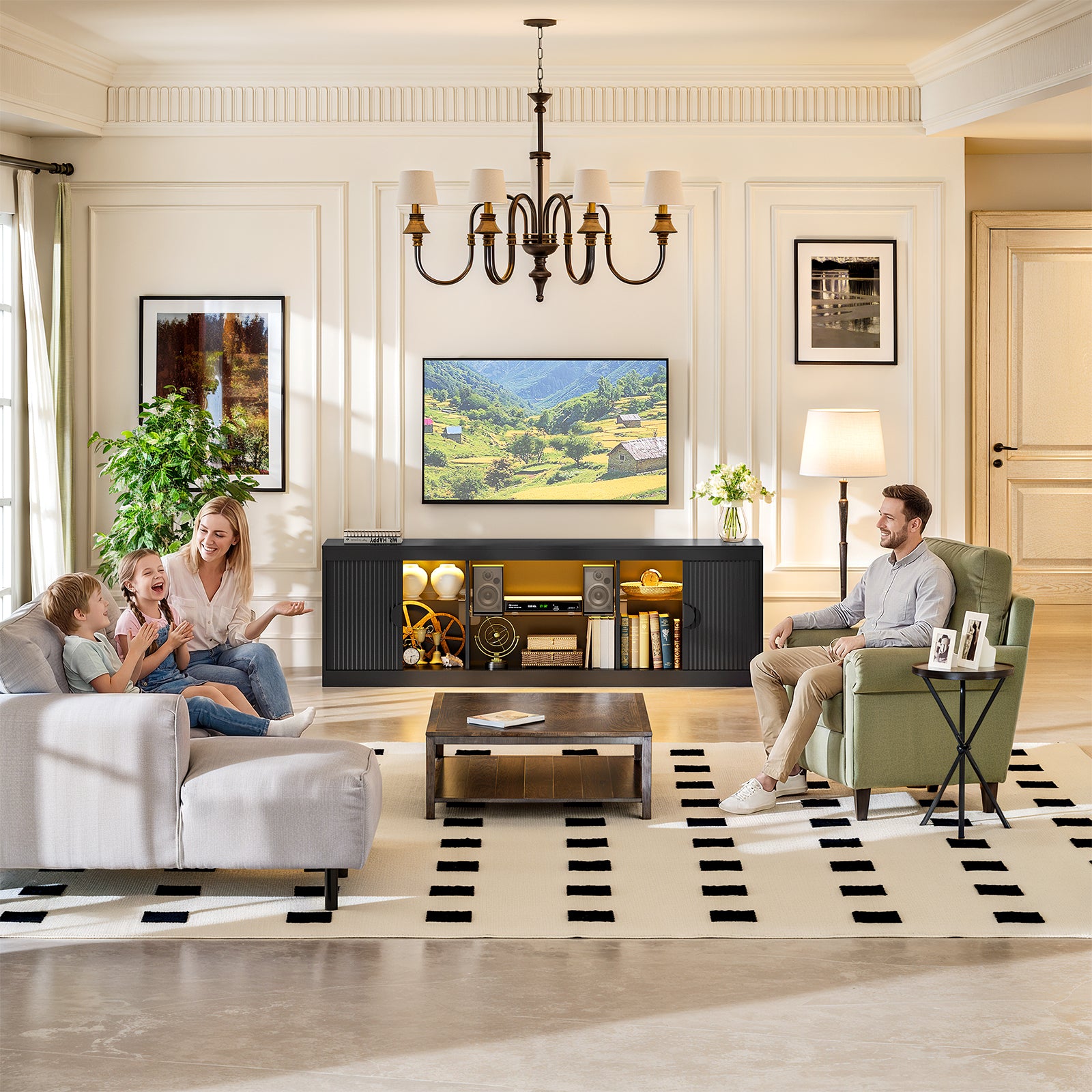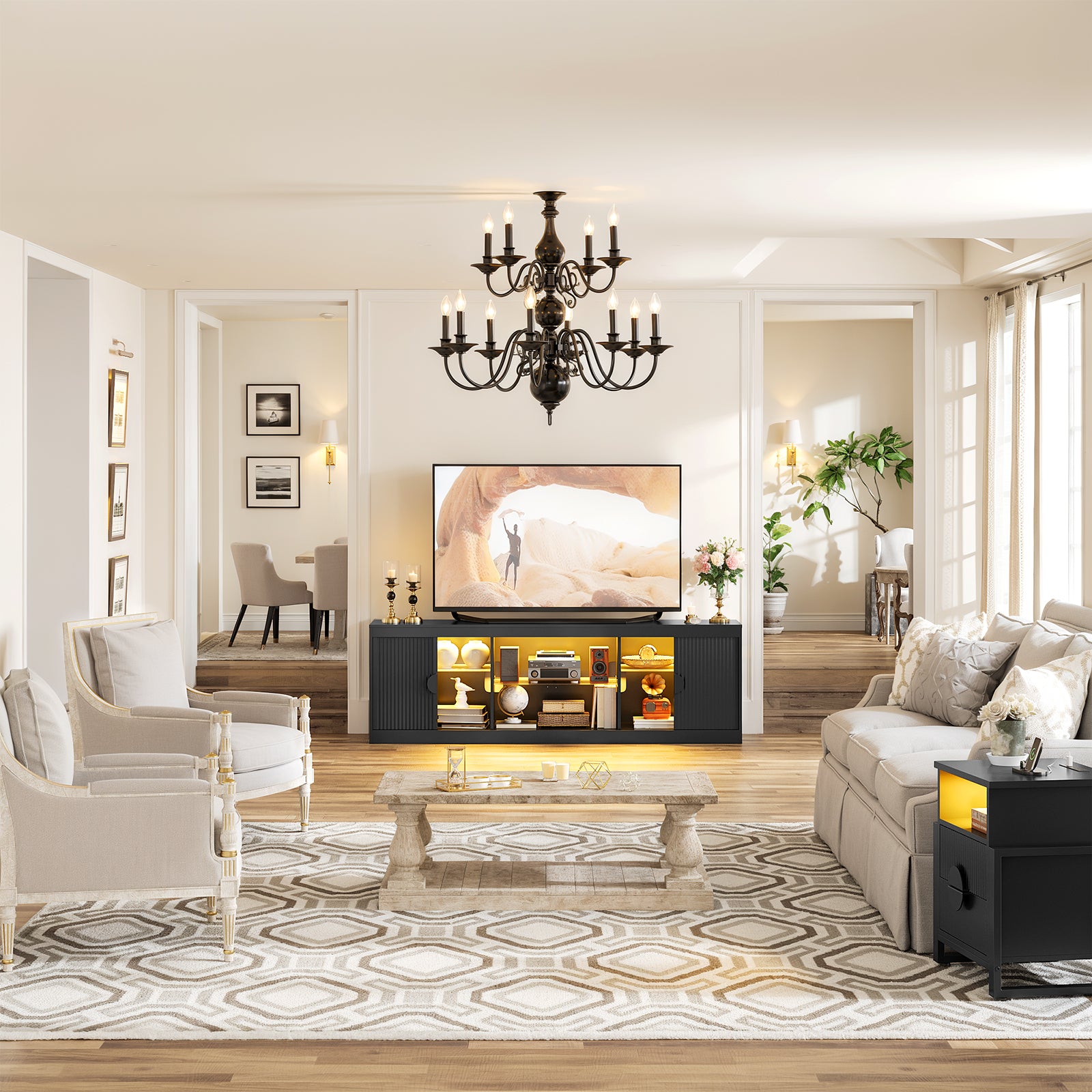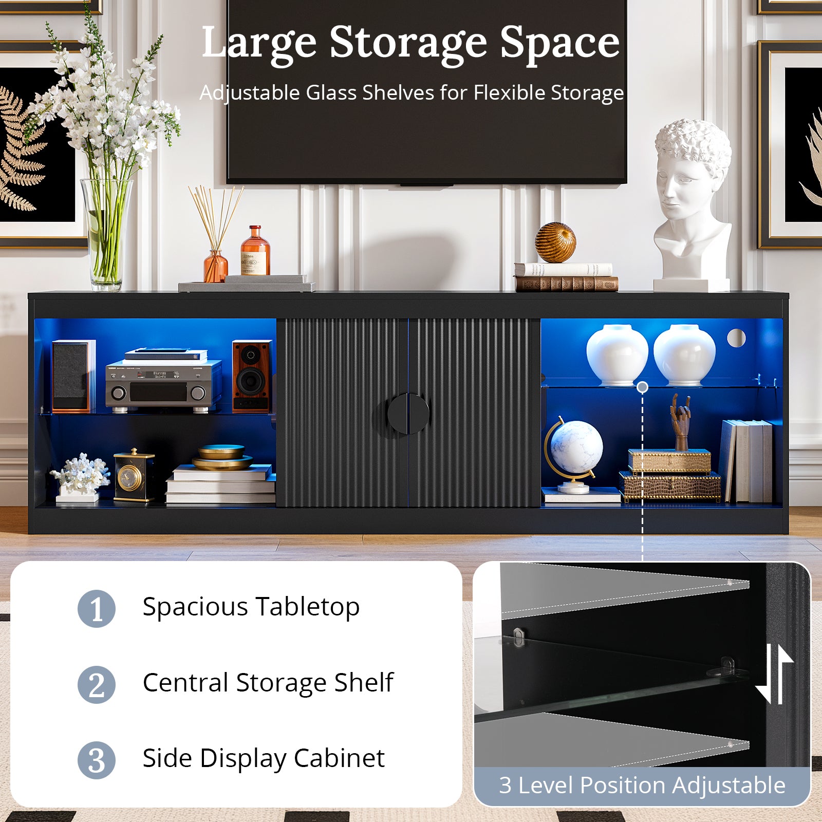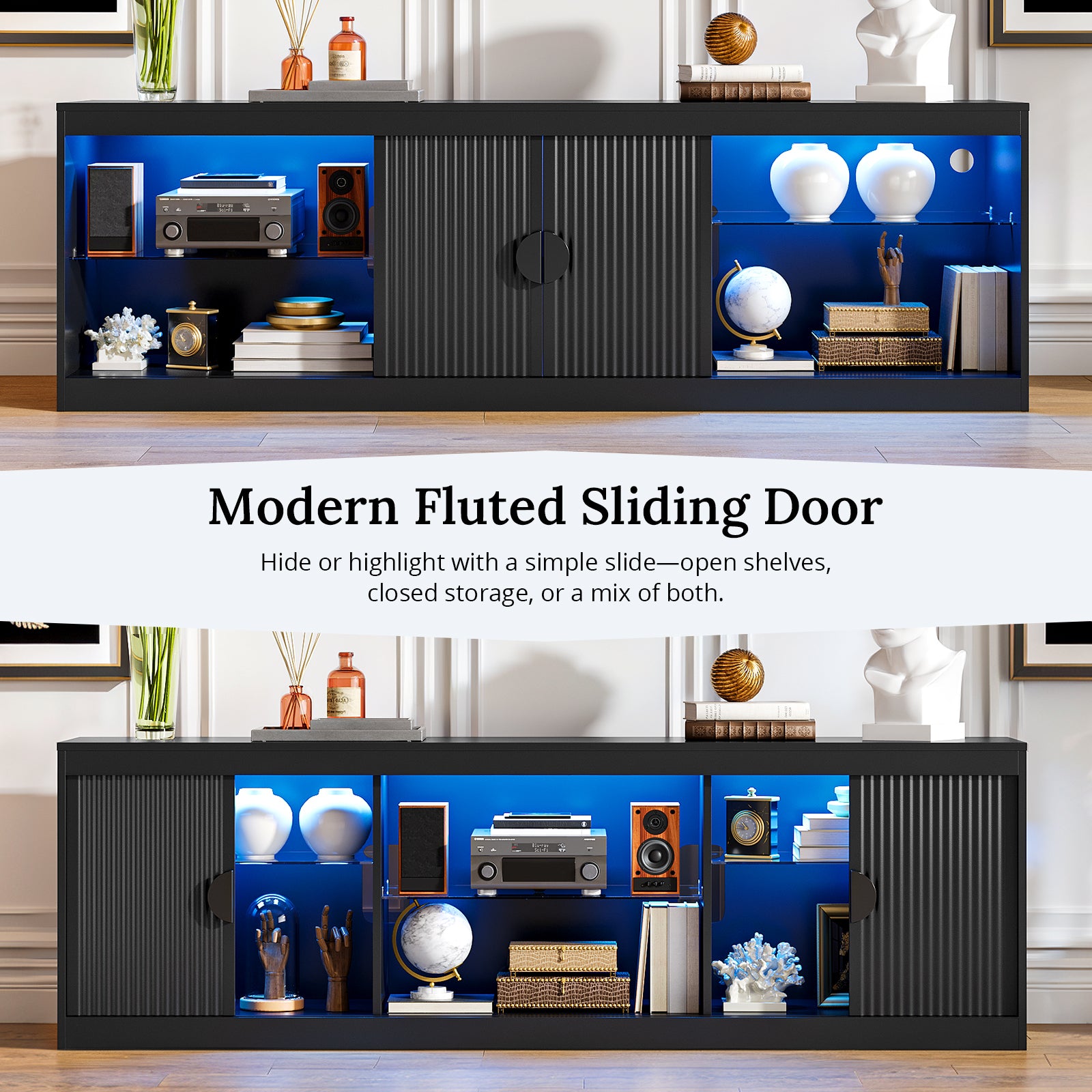 Elevate your living space with this fluted 70 inch TV Stand, a stylish and versatile entertainment center that seamlessly blends mid century and modern design. The combination of fashion and function makes your daily life more convenient. The media console is suitable for living rooms and bedrooms. Boasting an impressive 70-inch width, this TV stand can accommodate TVs up to 80 inches, providing ample space for your media setup.The TV stand's adjustable shelves provide additional storage options to keep your space neat and organized. Equipped with an LED light strip offering various lighting modes to complement home decor. Well-made with attention to detail, the entertainment center features 2 fluted doors to add a touch of elegance to your living room. Assembly is a breeze, thanks to the easy-to-follow instructions and numbered parts.