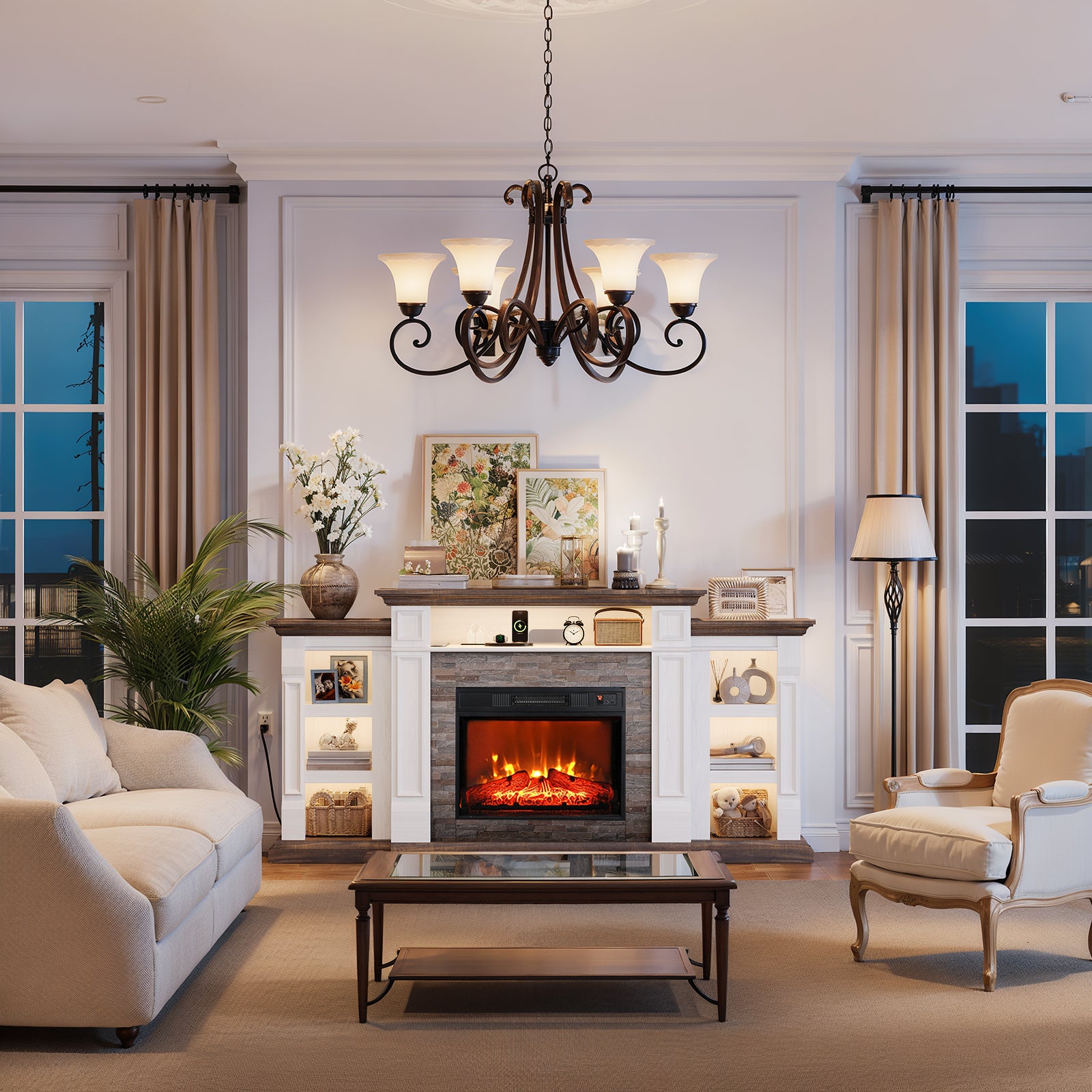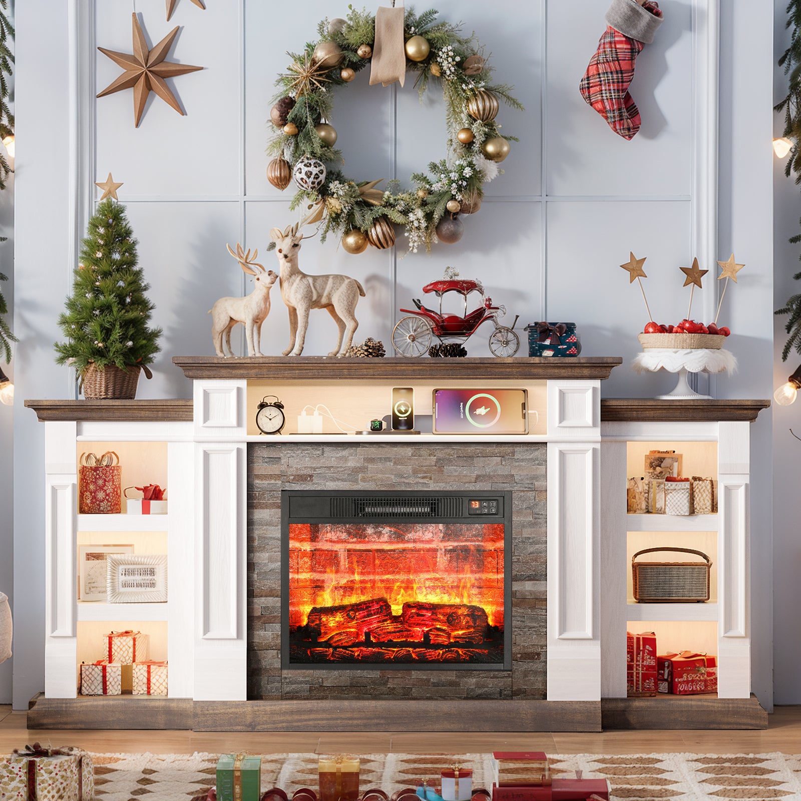 This 72 inch fireplace TV stand with mantel features adjustable, realistic logs and flames, creating the illusion of a real fireplace while adding warmth and character to your decor. The mantel includes a 23 inch plug-in electric fireplace that is both safe and energy-efficient. It heats a room quickly and has an automatic shut-off mechanism to prevent overheating. The fireplace's efficient 5000 BTU heat output ensures you stay warm all winter long. The TV stand has an open shelf on top.The mantel is flanked by three open shelves, providing space for storing CDs, remote controls, and other media devices. Crafted from engineered wood with a rustic, stacked stone appearance and beautiful edges, this mantel combines rustic and traditional styles seamlessly.The mantelpiece has LED light strips that can bring a strong festive atmosphere to your room. The top shelf has a built-in charging station with 2 power sockets, 1 Type-C port and 1 USB port, allows you to charge mobile devices such as cell phone, tablet etc.