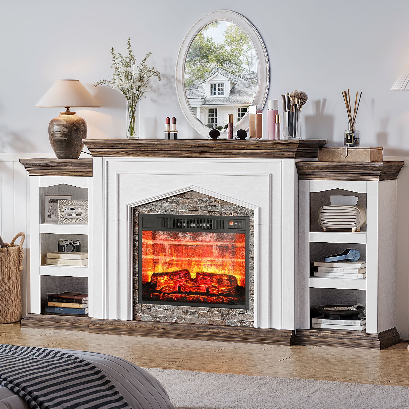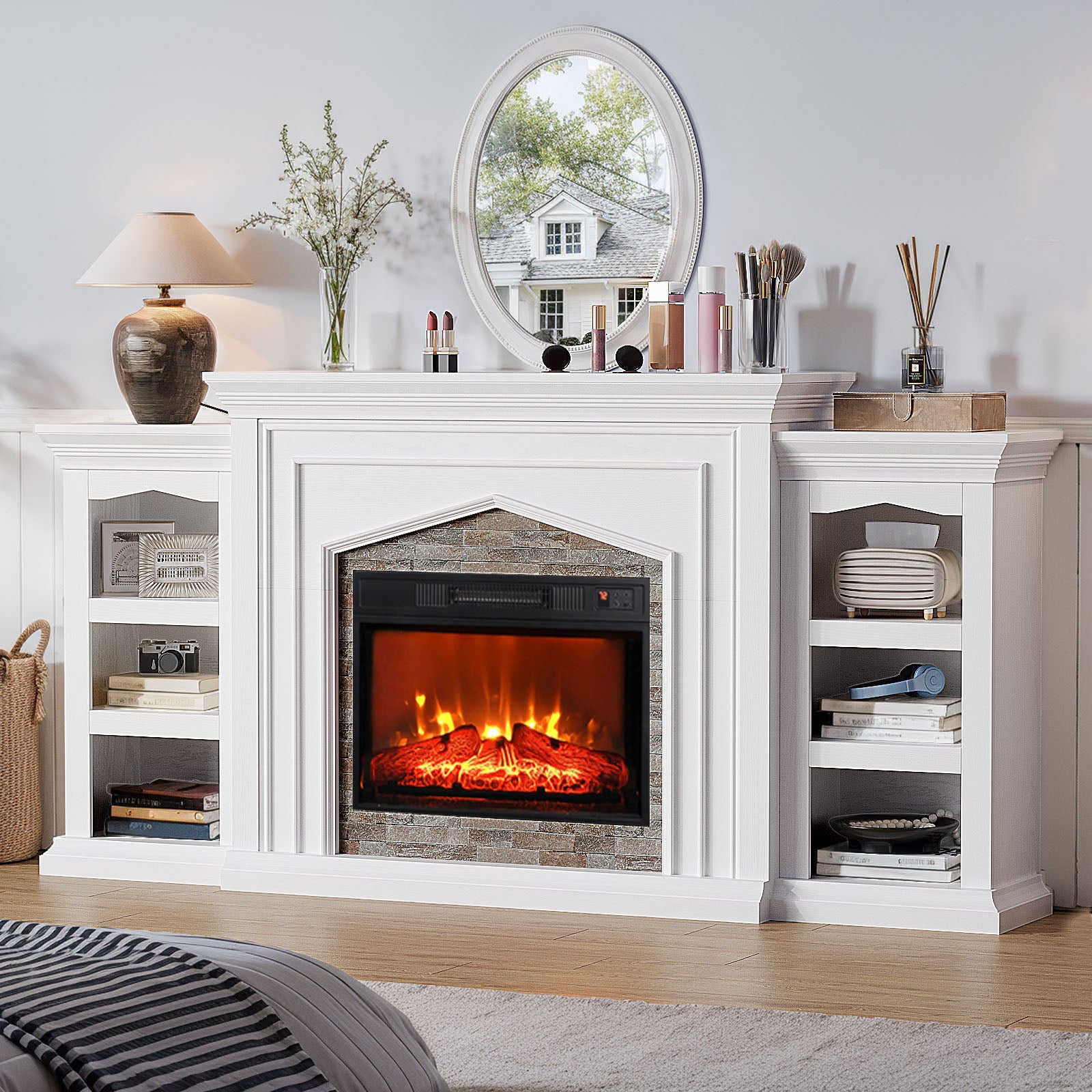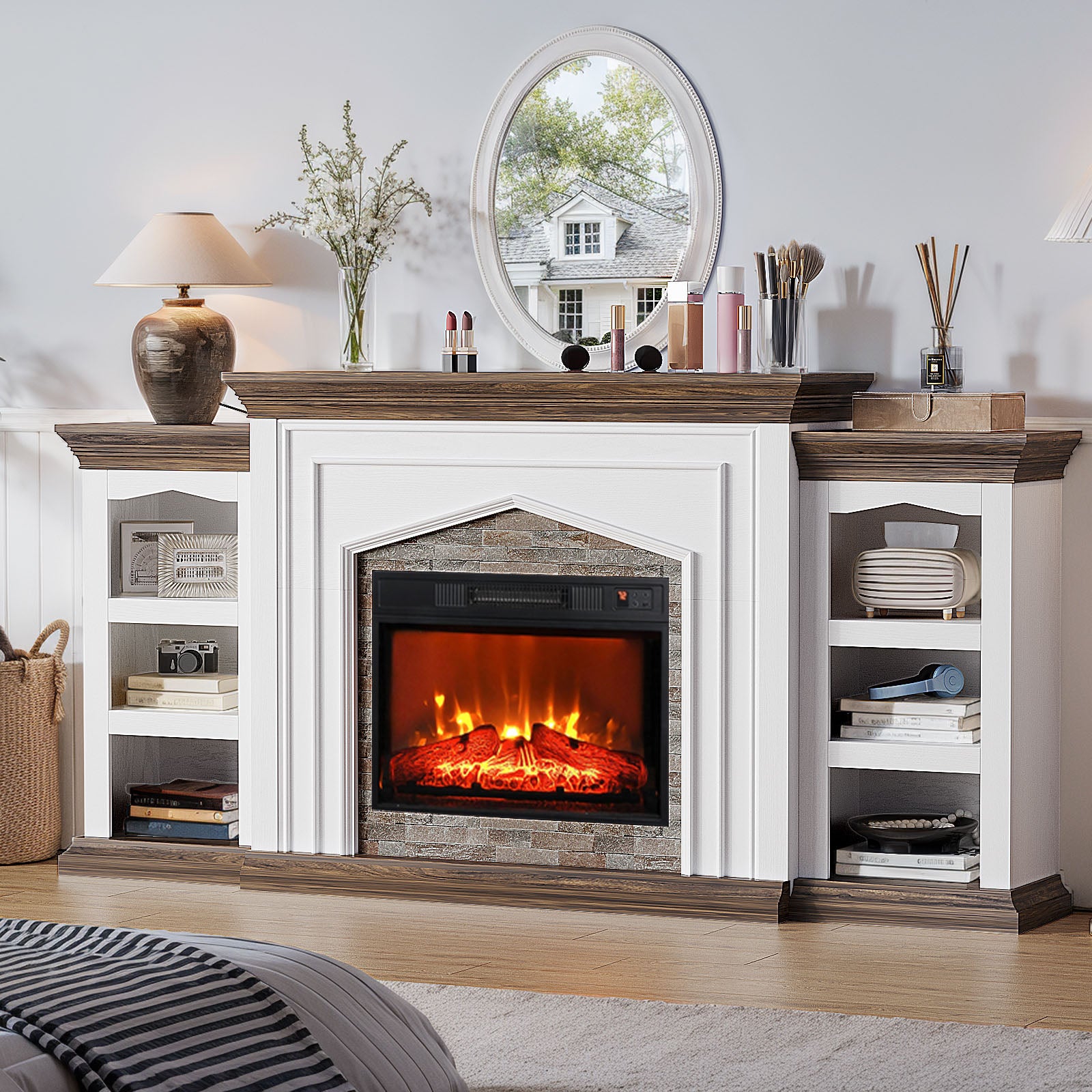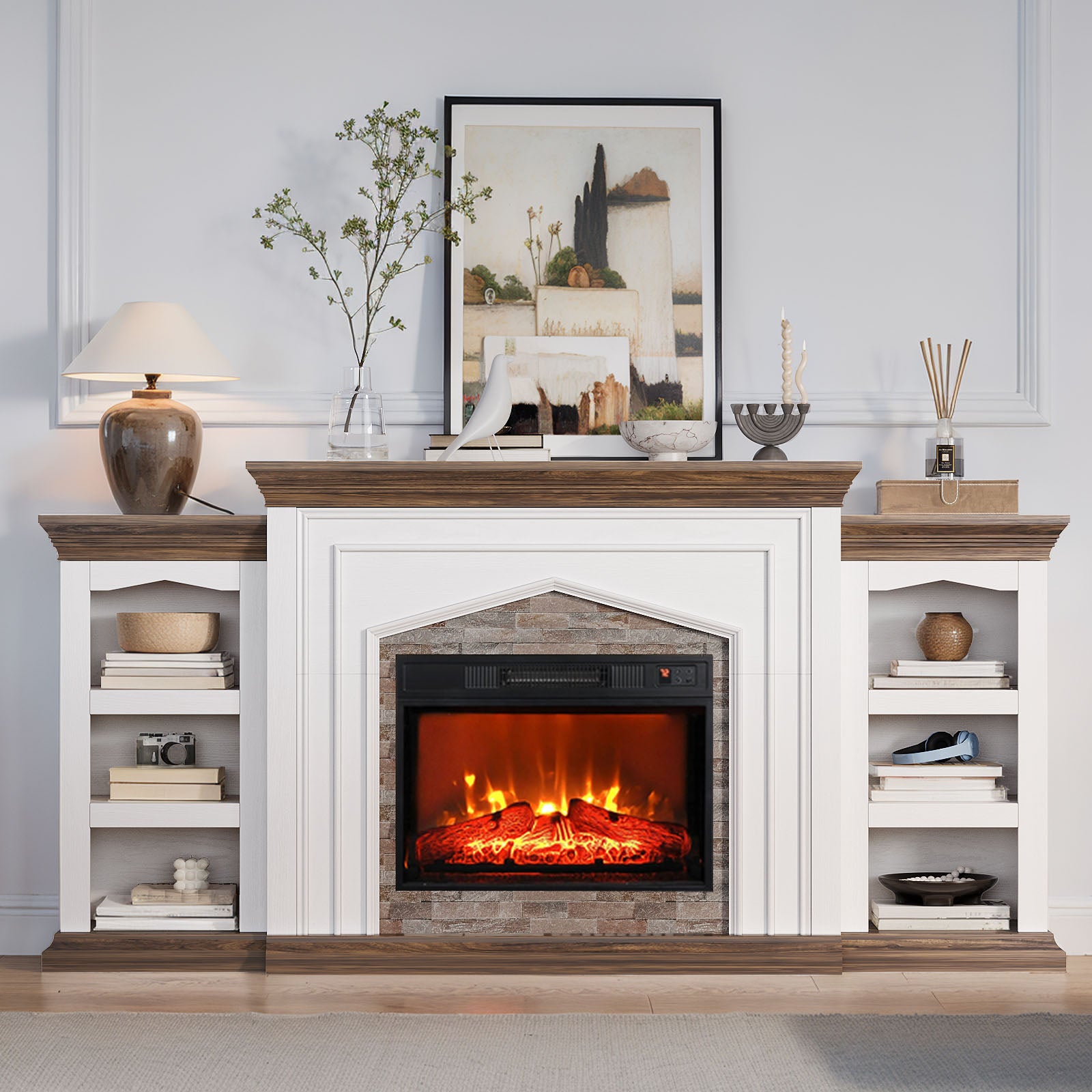 This 80 in electric mantel features adjustable realistic logs and flames. It creates the illusion of a real fireplace, adding warmth and character to your decor. The unit has a plug-in electric heater, which is safe and energy-saving. This fireplace heats a room quickly and has an automatic shut-off mechanism to prevent overheating. For your great convenience, it can also be controlled via remote control. The fireplace's efficient 5000 BTU heat output will keep you warm all winter long. The fireplace mental is flanked by three open shelves for storing CDs, remote controls, and other media devices. Crafted from engineered wood with a rustic stacked stone look and beautiful edges, this mantel was designed with a mix of rustic and traditional styles in mind. It not only serves as a mantel, but also can be used as a living room TV stand, entertainment center, storage rack, display rack to embellish your living space.