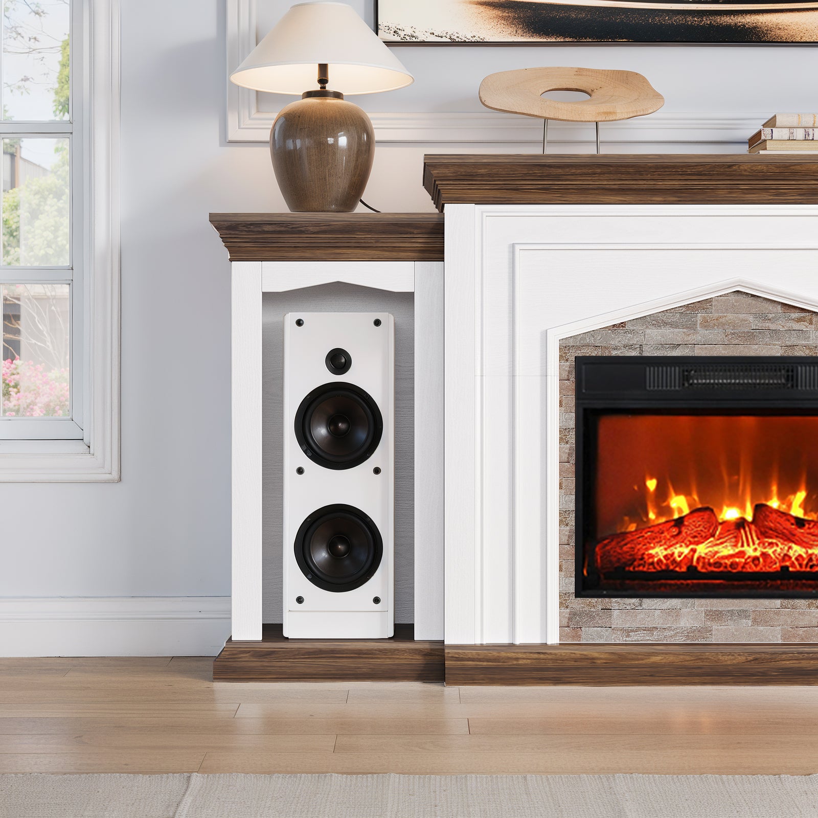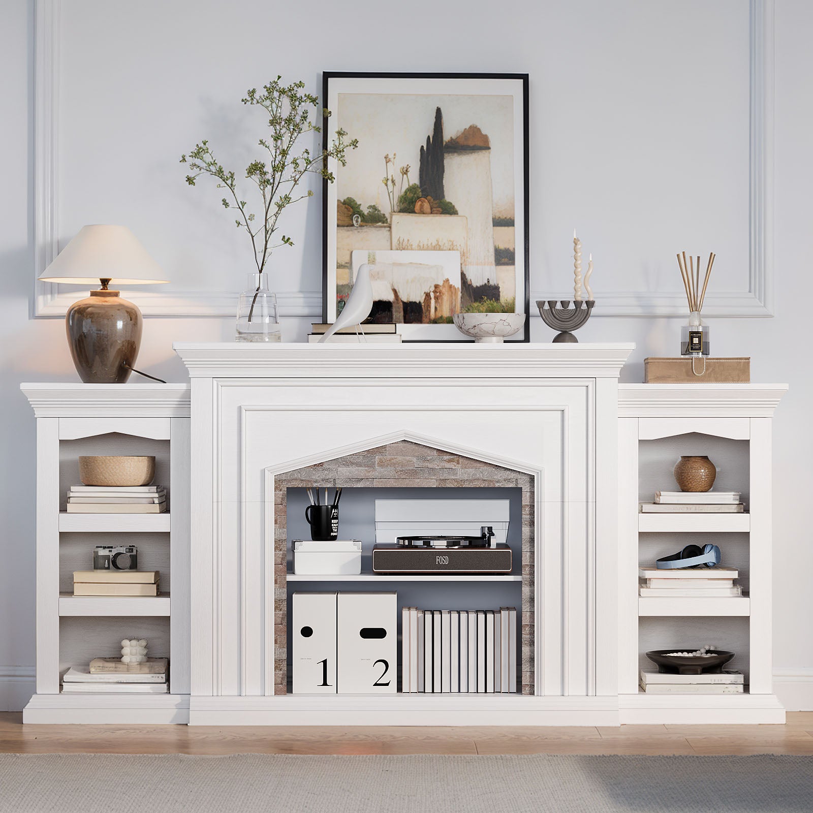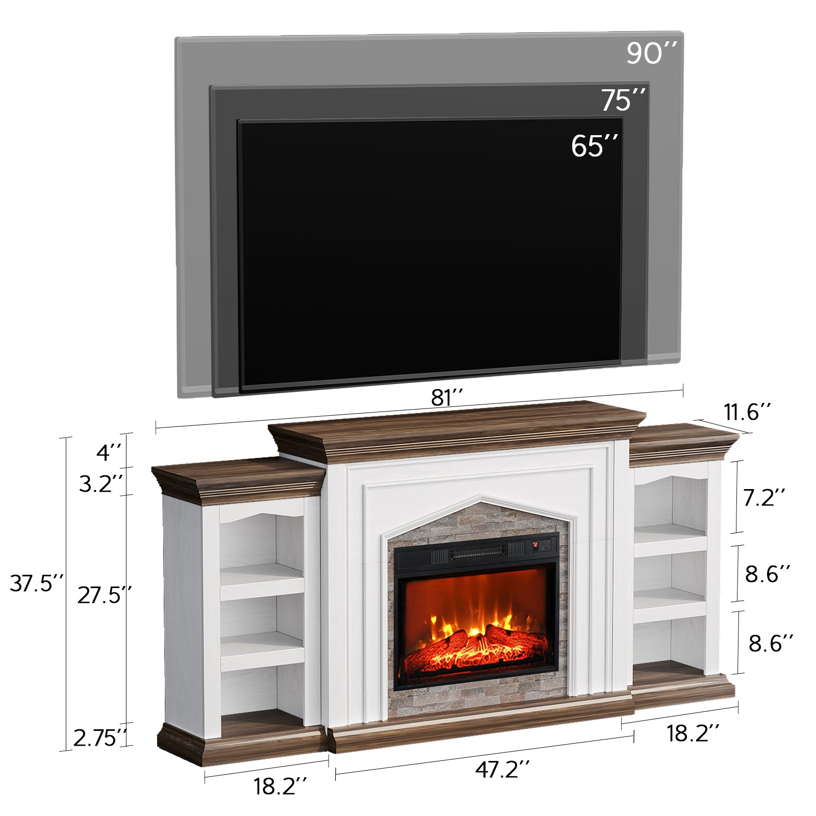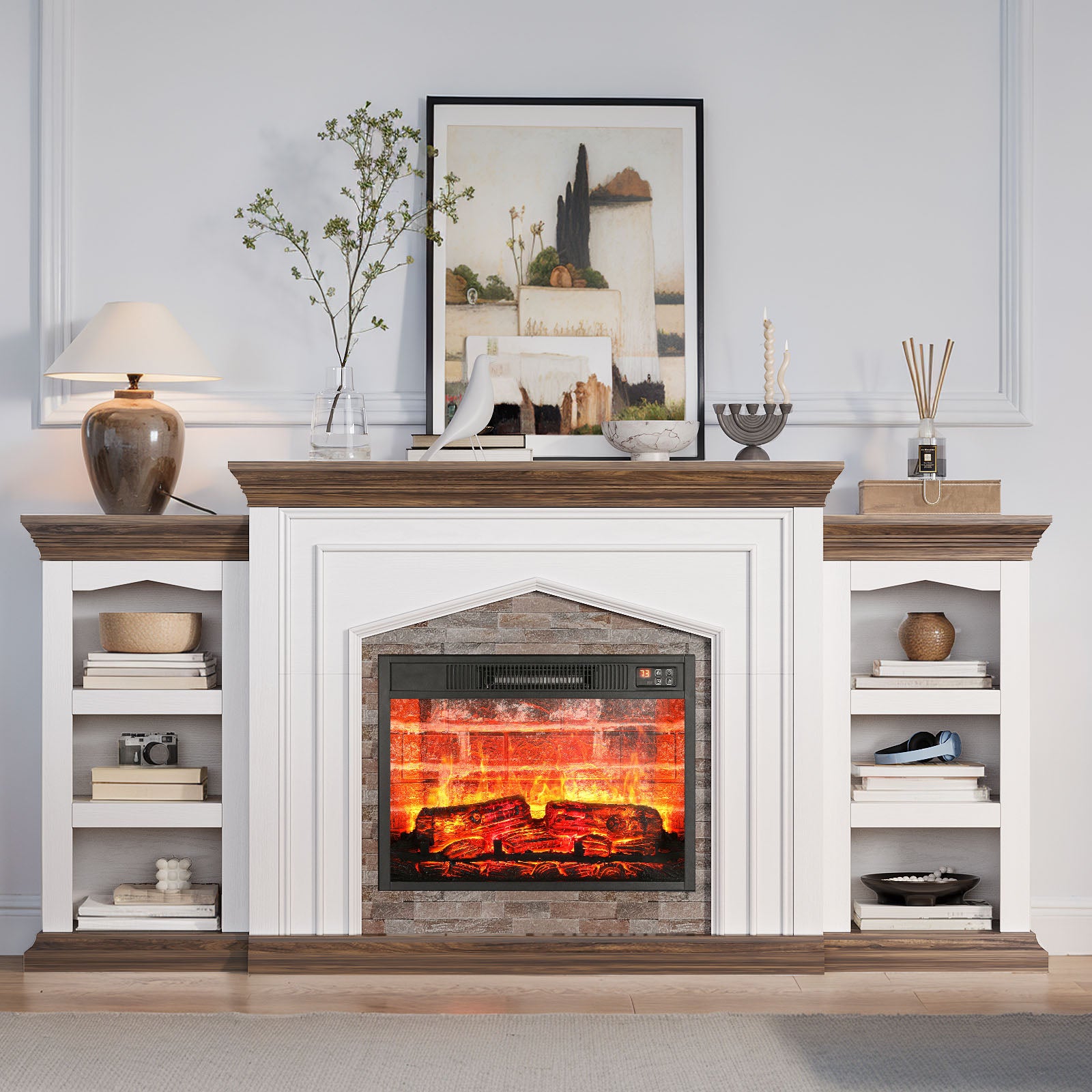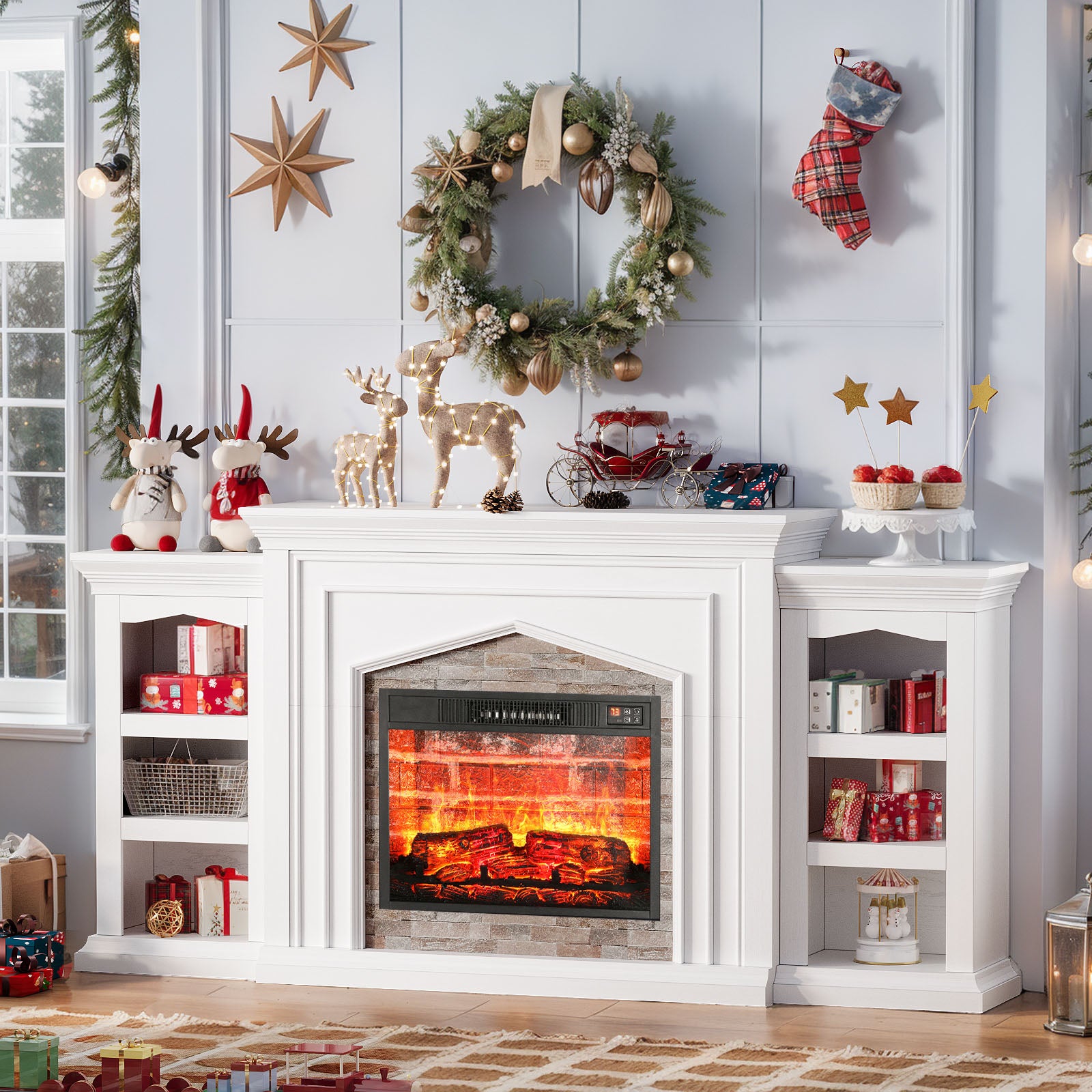 This 80 in electric mantel features adjustable realistic logs and flames. It creates the illusion of a real fireplace, adding warmth and character to your decor. The unit has a plug-in electric heater, which is safe and energy-saving. This fireplace heats a room quickly and has an automatic shut-off mechanism to prevent overheating. For your great convenience, it can also be controlled via remote control. The fireplace's efficient 5000 BTU heat output will keep you warm all winter long. The fireplace mental is flanked by three open shelves for storing CDs, remote controls, and other media devices. Crafted from engineered wood with a rustic stacked stone look and beautiful edges, this mantel was designed with a mix of rustic and traditional styles in mind. It not only serves as a mantel, but also can be used as a living room TV stand, entertainment center, storage rack, display rack to embellish your living space.