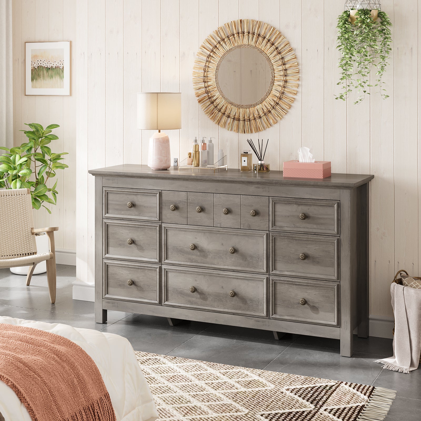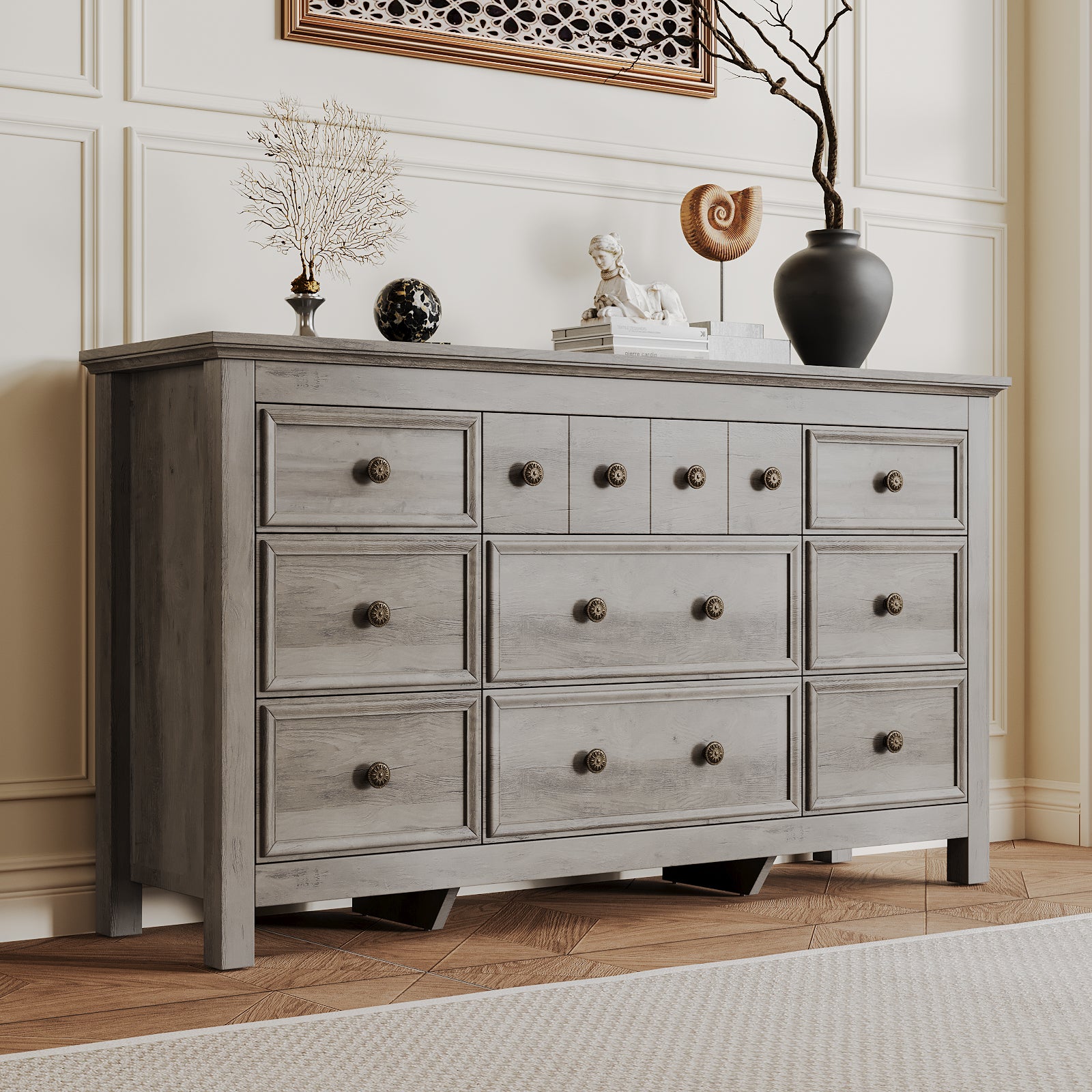 【Spacious Storage Space】There are 3 large drawers and 6 medium drawers, which can easily organize your items and help keep the room clean and tidy. The spacious top is perfect for placing table lamps, plants and other decorations.