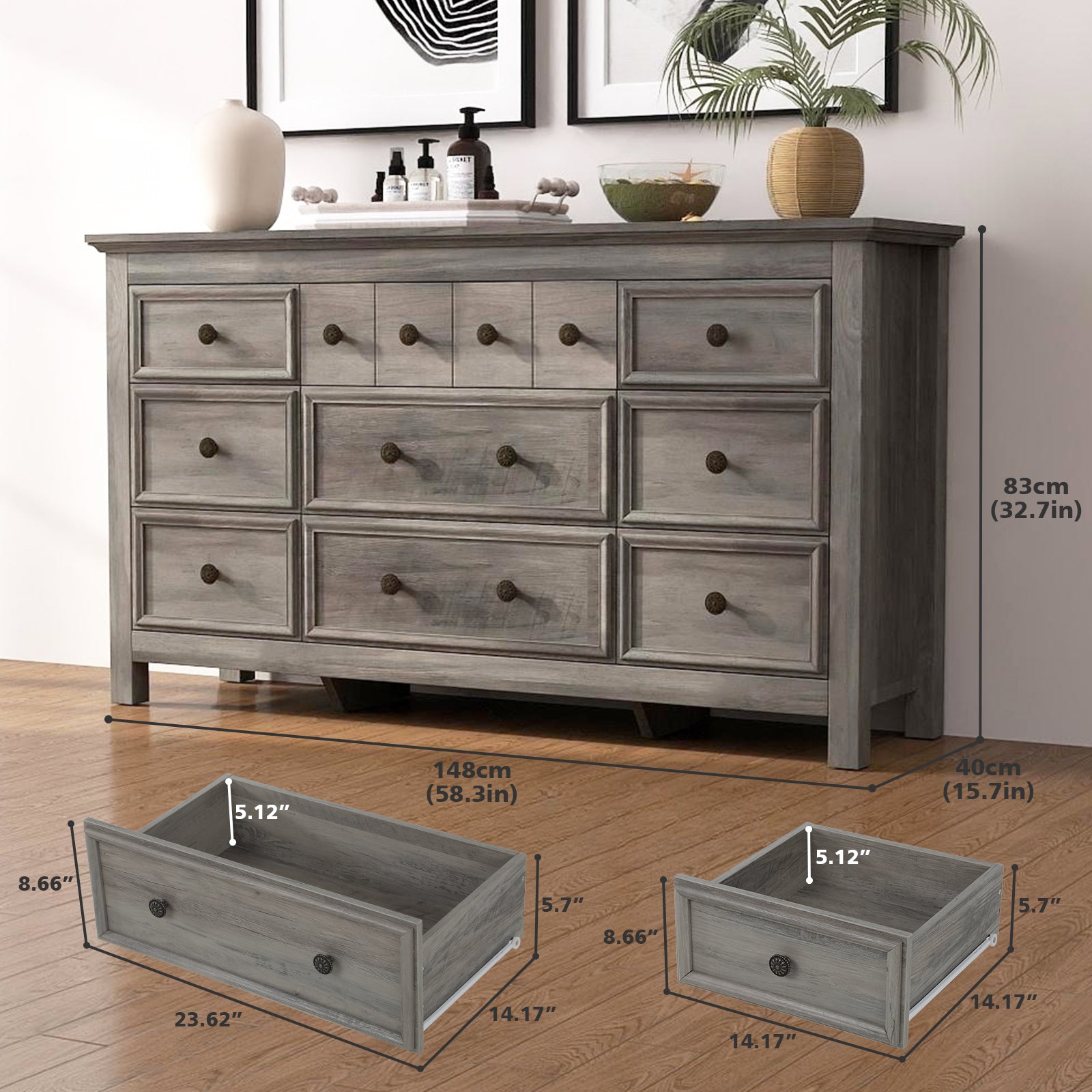 【Multi-functional Dresser】This 9 drawer dresser is a versatile piece of furniture suitable for any room. Use it as a bedroom storage chest, an entryway accent, a hallway organizer, or even as a TV stand in the living room.