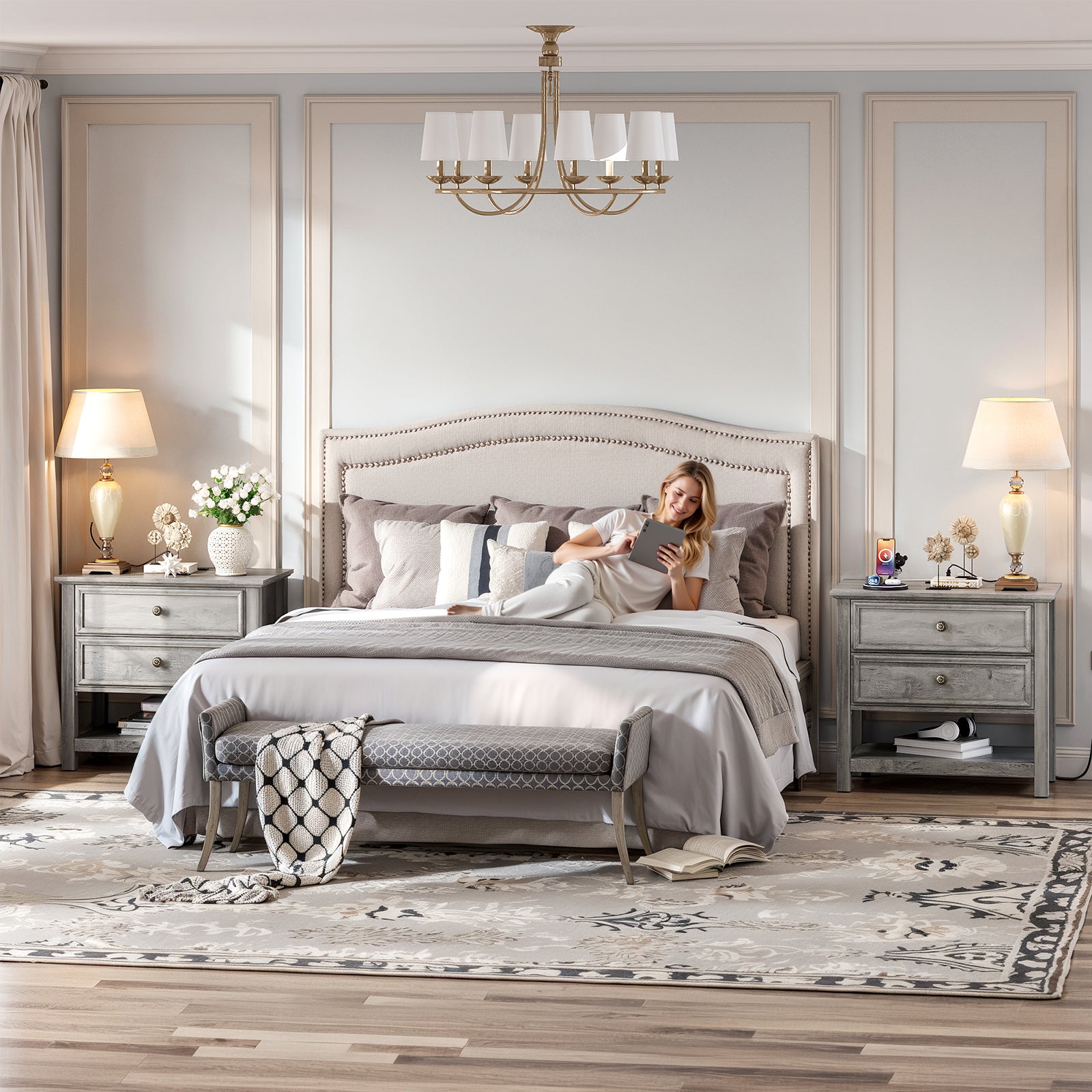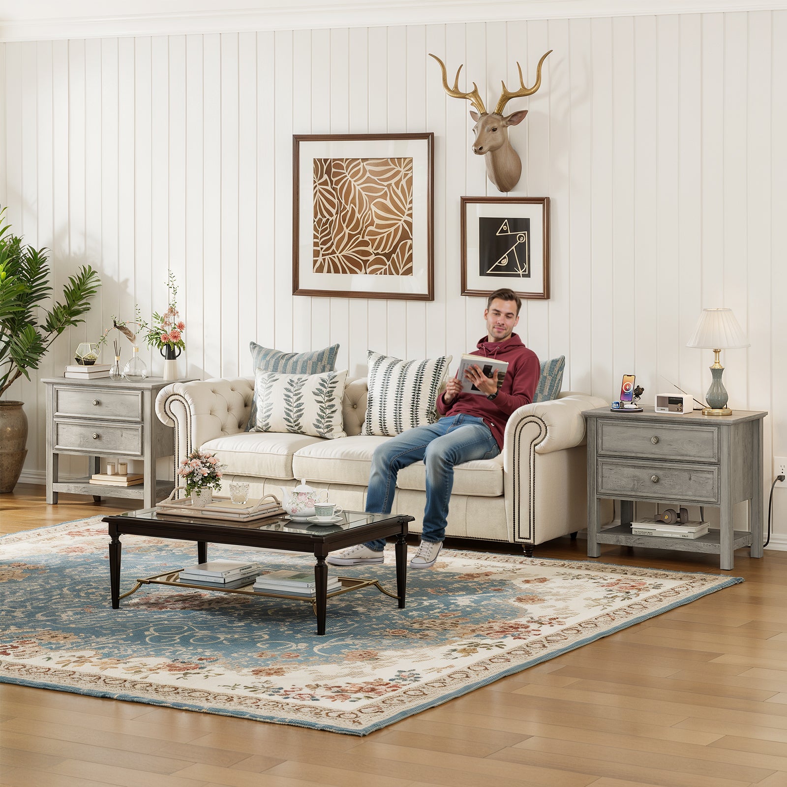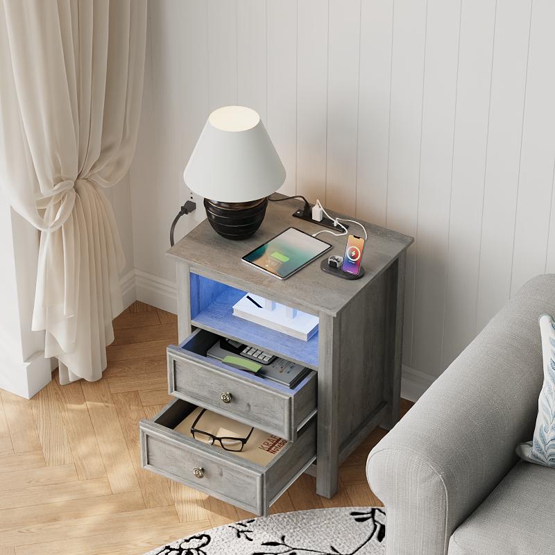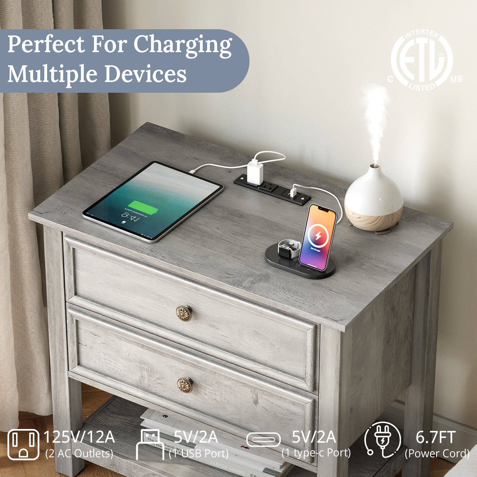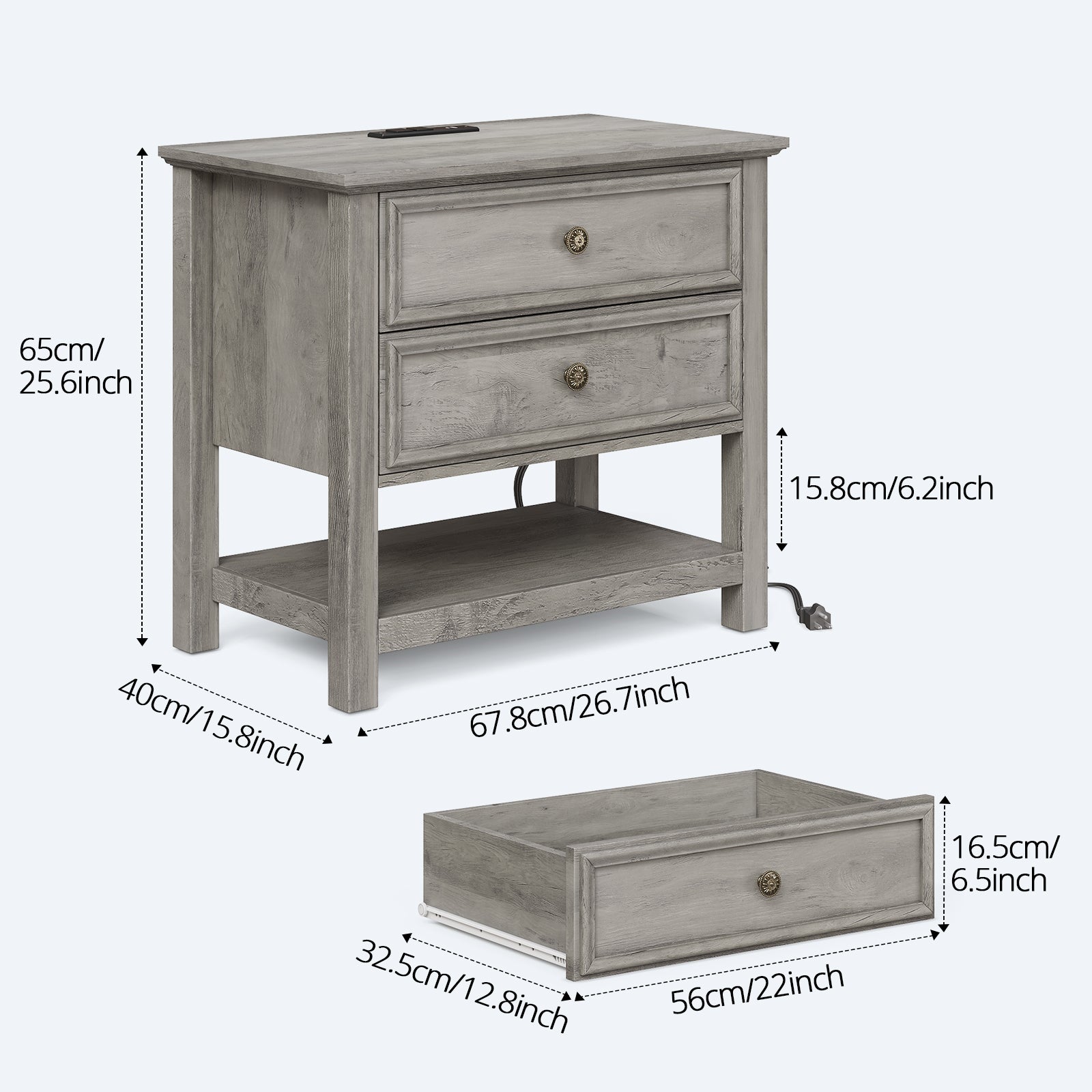 This Nightstand is elegant in workmanship, added borders on the drawer front, combined with the classic wood grain, adds a modern feel with a suitably vintage flavor. Dresser with 2 drawers are all equipped with wide slides, get painstaking treatment for smooth gliding and easy use. 2 Power Outlets, 1 Type-C Port and 1 USB Port allows you to charge mobile devices such as cell phone, tablet etc, allowing you to easily power your devices without leaving the bed. With a open shelf and two drawers, your bedroom storage space will be maximized. This multifunctional side table is designed to be sturdy and stable, and can also serve as a coffee table or storage solution for various rooms in your home, adding a touch of rustic elegance to your decor.
