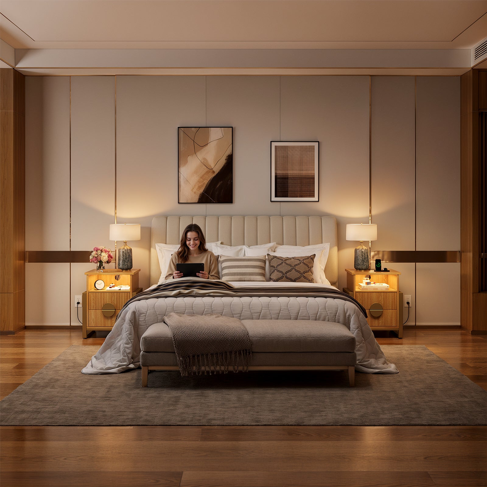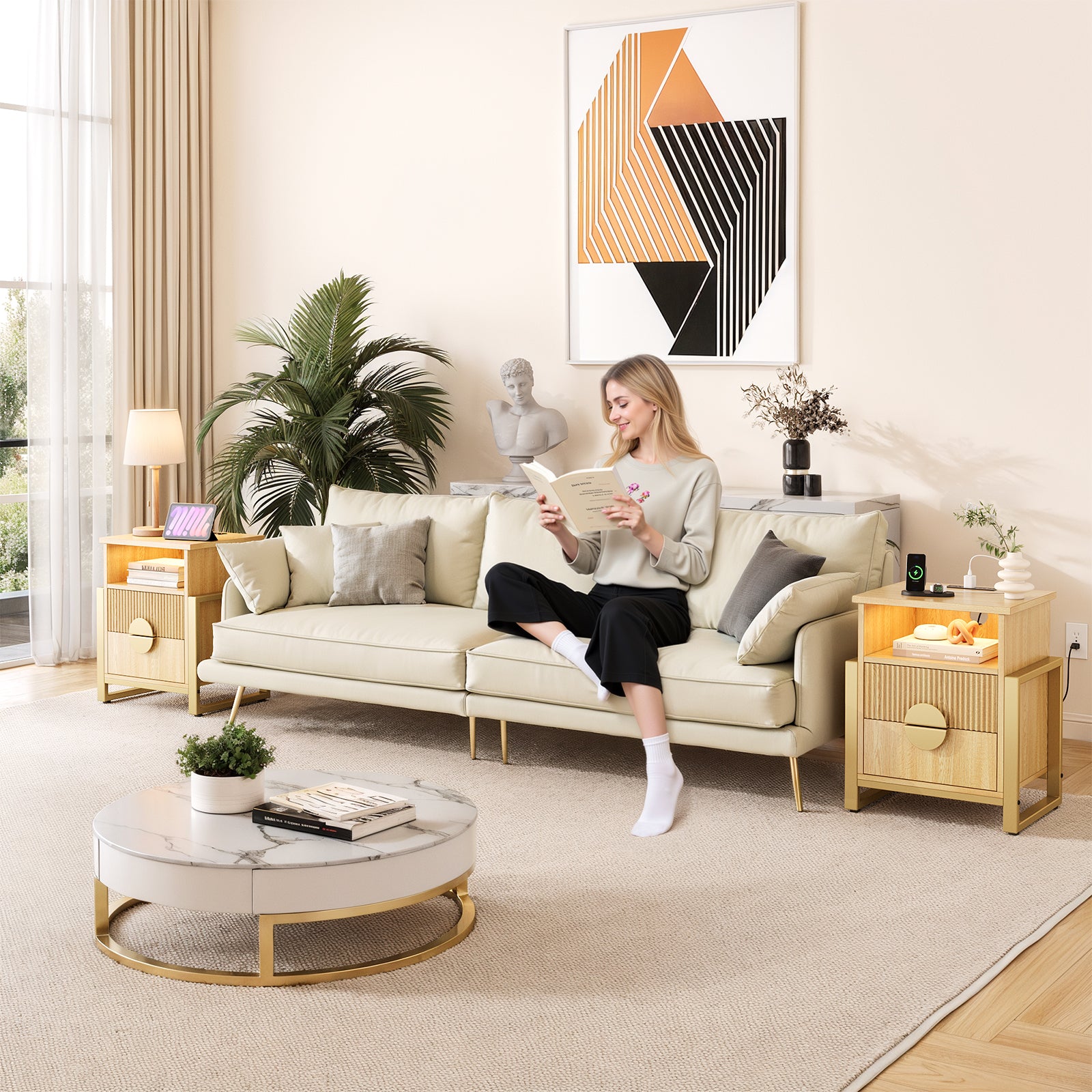Go to the shopThis Nightstand is elegant in workmanship adds a modern feel with a suitably vintage flavor. Dresser with 2 drawers are all equipped with wide slides, get painstaking treatment for smooth gliding and easy use. 2 Standard Plug Outlets & 2 USB Ports port allows you to charge mobile devices such as cell phone, tablet etc. With a open shelf and two drawers, your bedroom storage space will be maximized. This nightstand features a LED light strip so you don't have to worry about it falling off, and it's available in over 16 colors. You can freely choose your favorite color, brightness and flashing mode through the remote control or mobile app to create the perfect atmosphere. Ideal as a nightstand, bedside table, coffee table, side table and more.