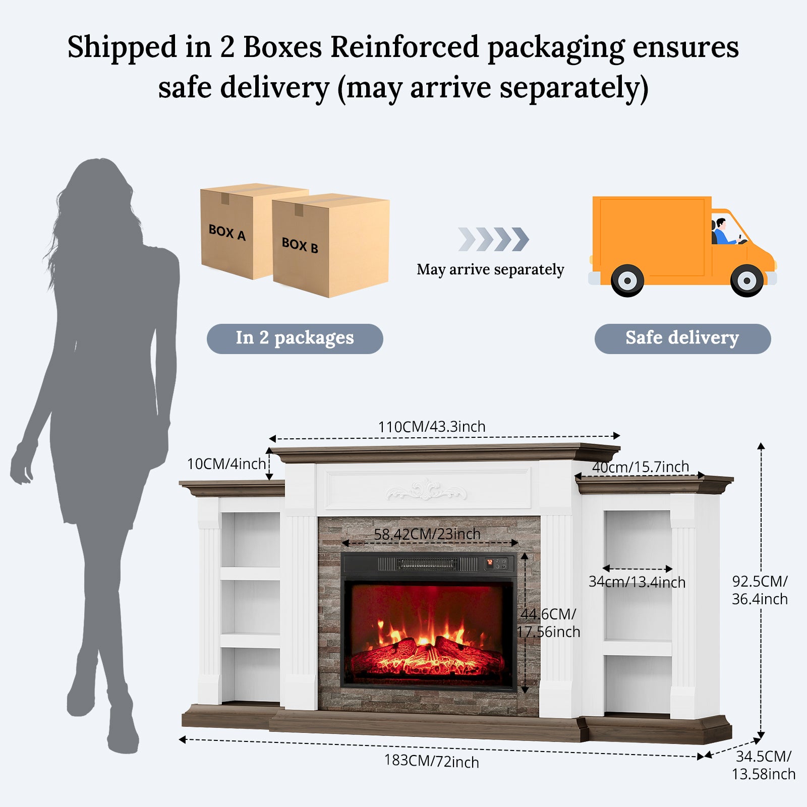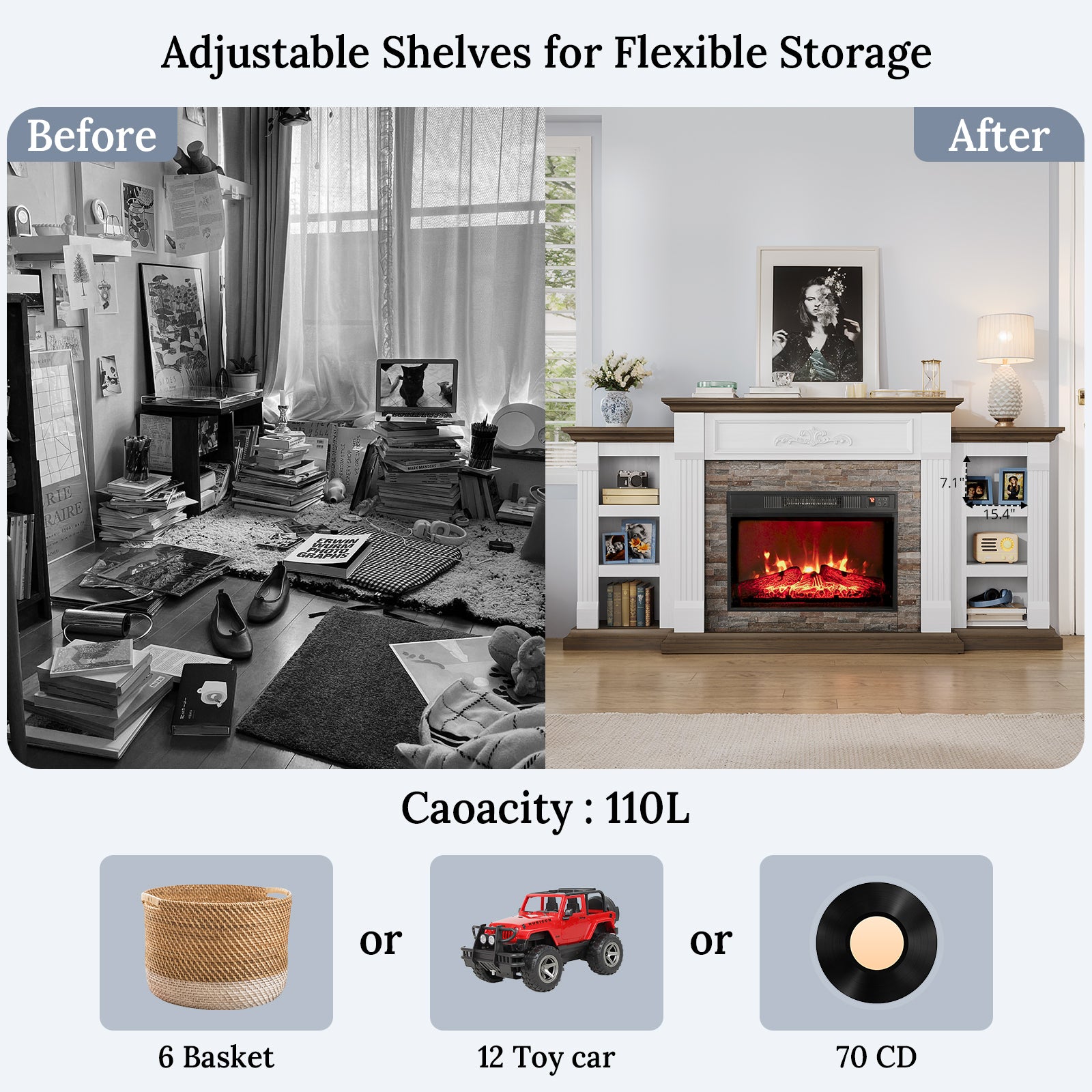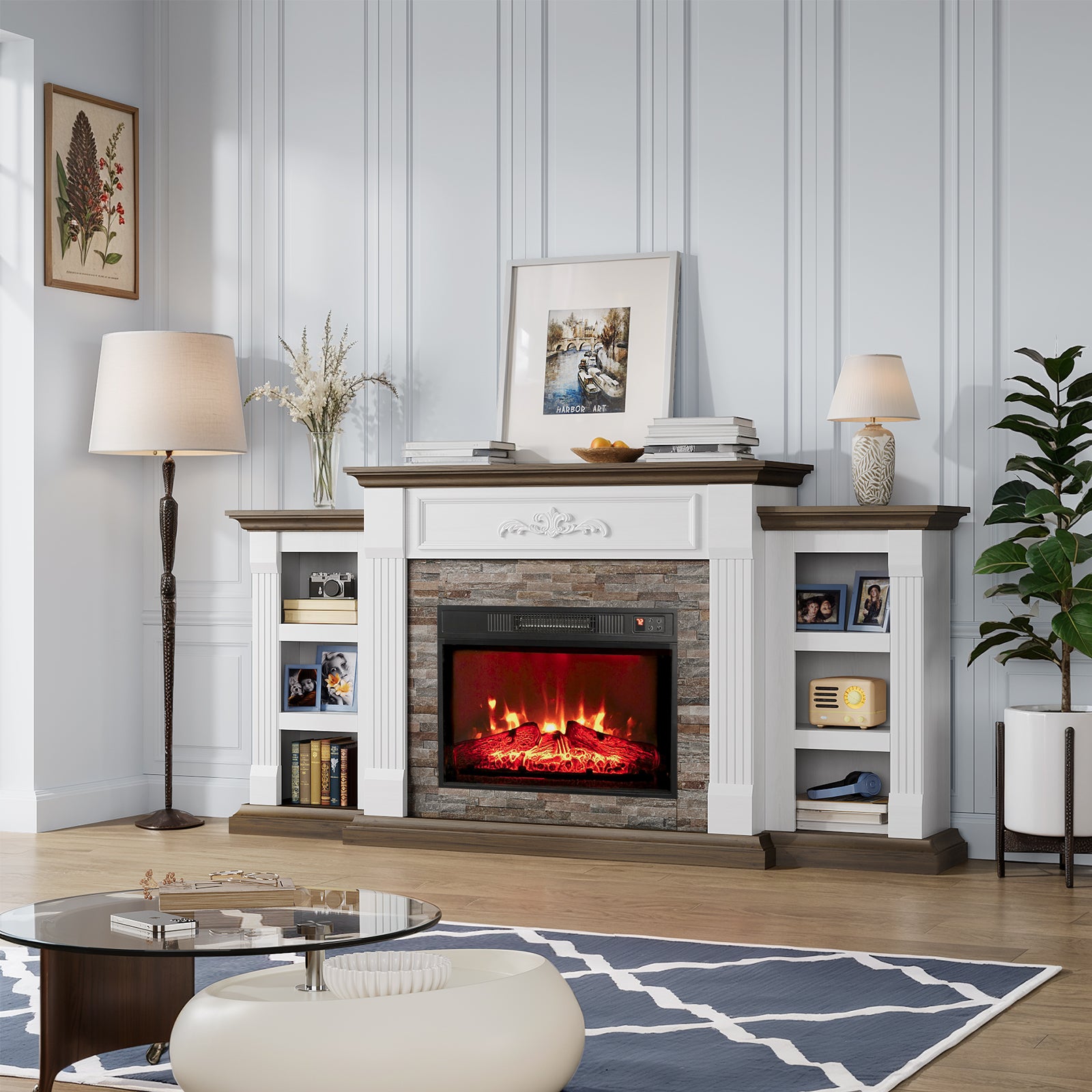 Go to the shopThis 72 in electric mantel features adjustable realistic logs and flames. It creates the illusion of a real fireplace, adding warmth and character to your decor. The unit has a plug-in electric heater, which is safe and energy-saving. This fireplace heats a room quickly and has an automatic shut-off mechanism to prevent overheating. For your great convenience, it can also be controlled via remote control. The fireplace's efficient 5000 BTU heat output will keep you warm all winter long. The fireplace mental is flanked by three open shelves for storing CDs, remote controls, and other media devices. Crafted from engineered wood with a rustic stacked stone look and beautiful edges, this mantel was designed with a mix of rustic and traditional styles in mind. It not only serves as a mantel, but also can be used as a living room TV stand, entertainment center, storage rack, display rack to embellish your living space.