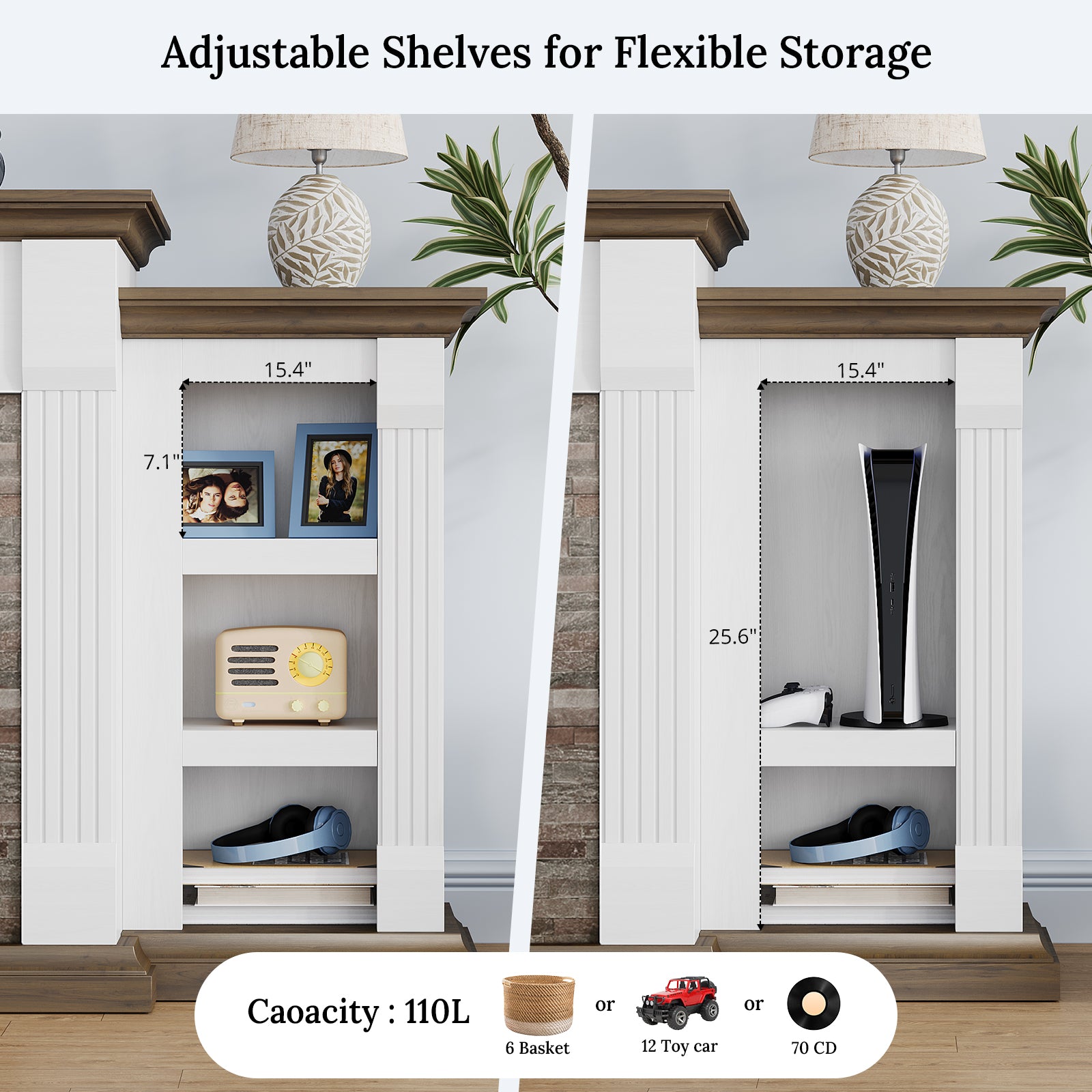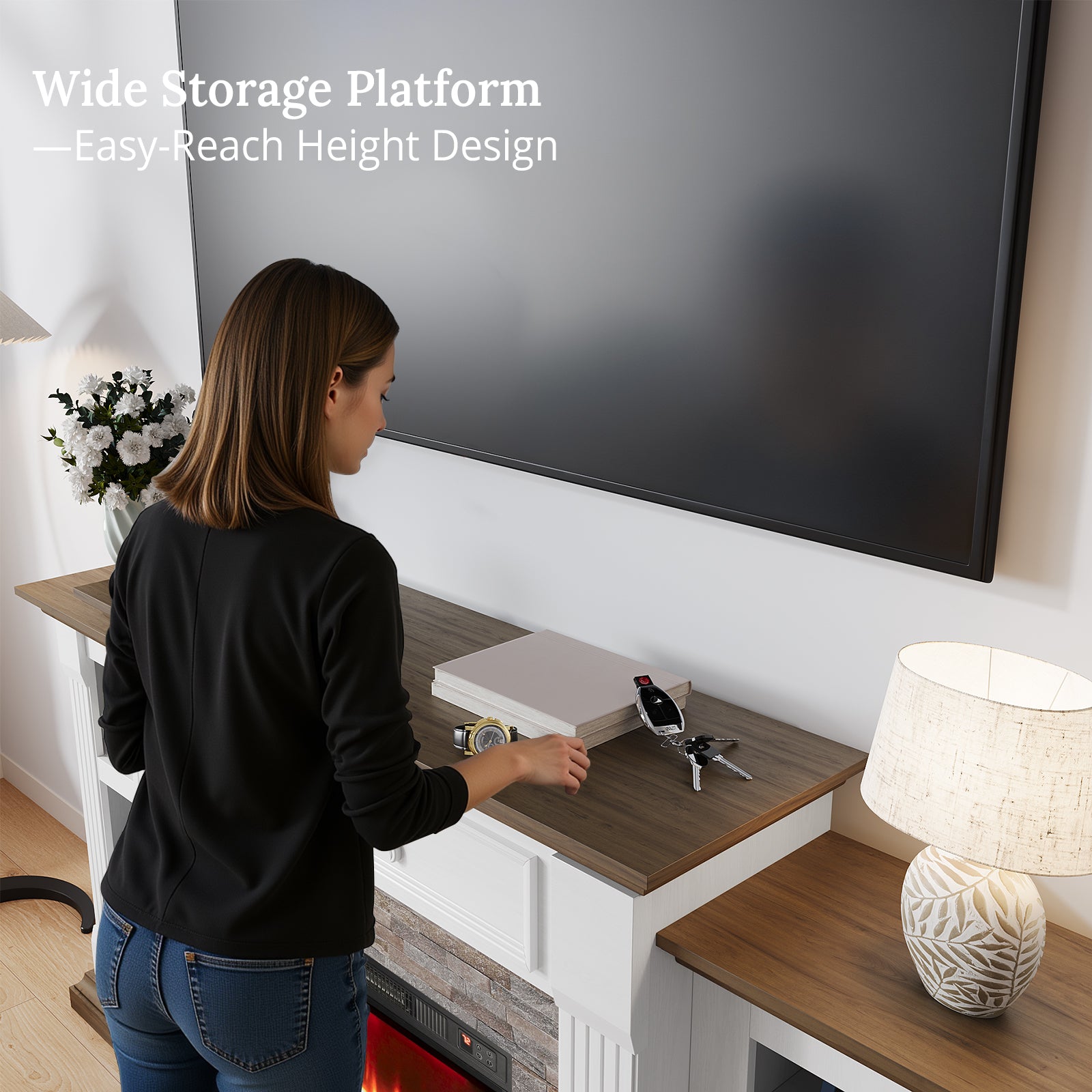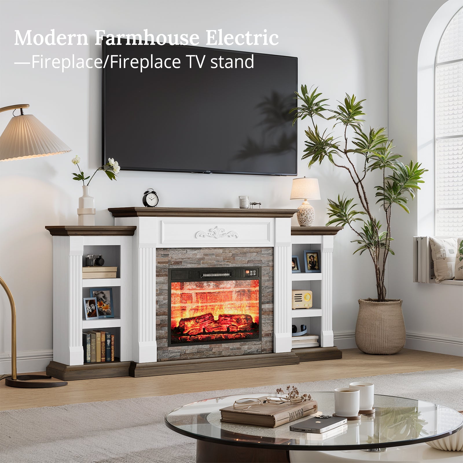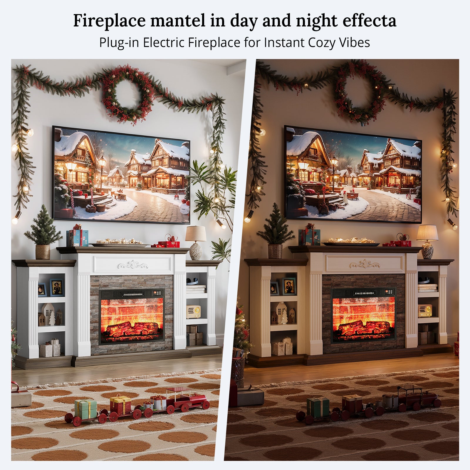 Go to the shopThis 72 in electric mantel features adjustable realistic logs and flames. It creates the illusion of a real fireplace, adding warmth and character to your decor. The unit has a plug-in electric heater, which is safe and energy-saving. This fireplace heats a room quickly and has an automatic shut-off mechanism to prevent overheating. For your great convenience, it can also be controlled via remote control. The fireplace's efficient 5000 BTU heat output will keep you warm all winter long. The fireplace mental is flanked by three open shelves for storing CDs, remote controls, and other media devices. Crafted from engineered wood with a rustic stacked stone look and beautiful edges, this mantel was designed with a mix of rustic and traditional styles in mind. It not only serves as a mantel, but also can be used as a living room TV stand, entertainment center, storage rack, display rack to embellish your living space.